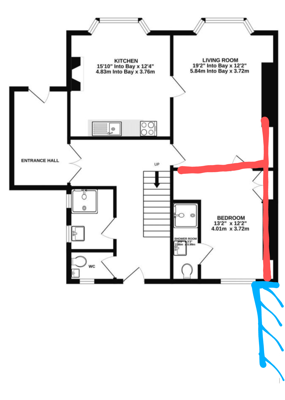 Were looking to remove a fireplace and knock through two rooms and need a beam as shown in red on the picture. Where the beam for the fireplace meets the exterior wall at the bottom of the plan is directly above a flat roofed extension from next door, the blue shaded area. It's an odd property boundary.