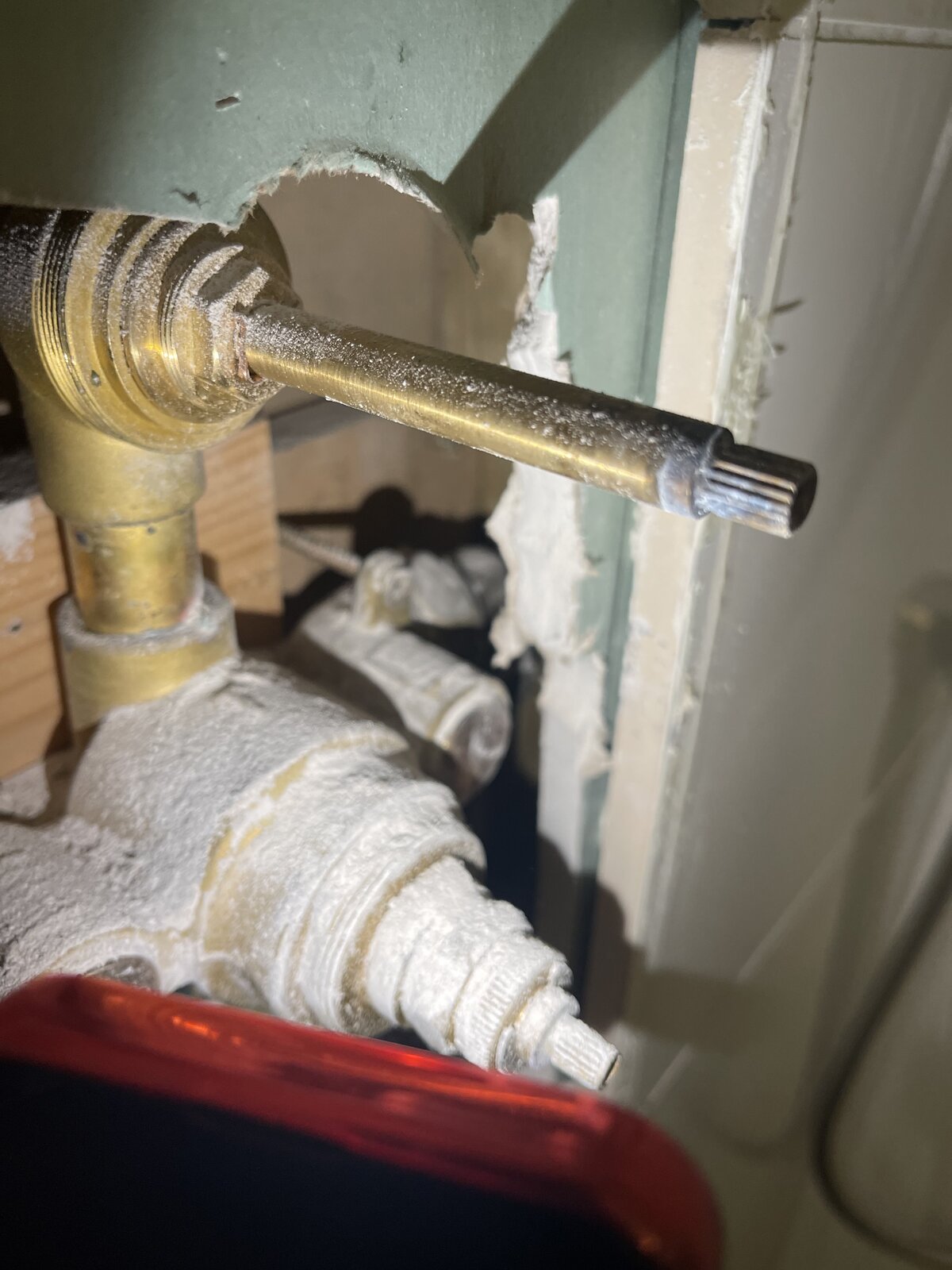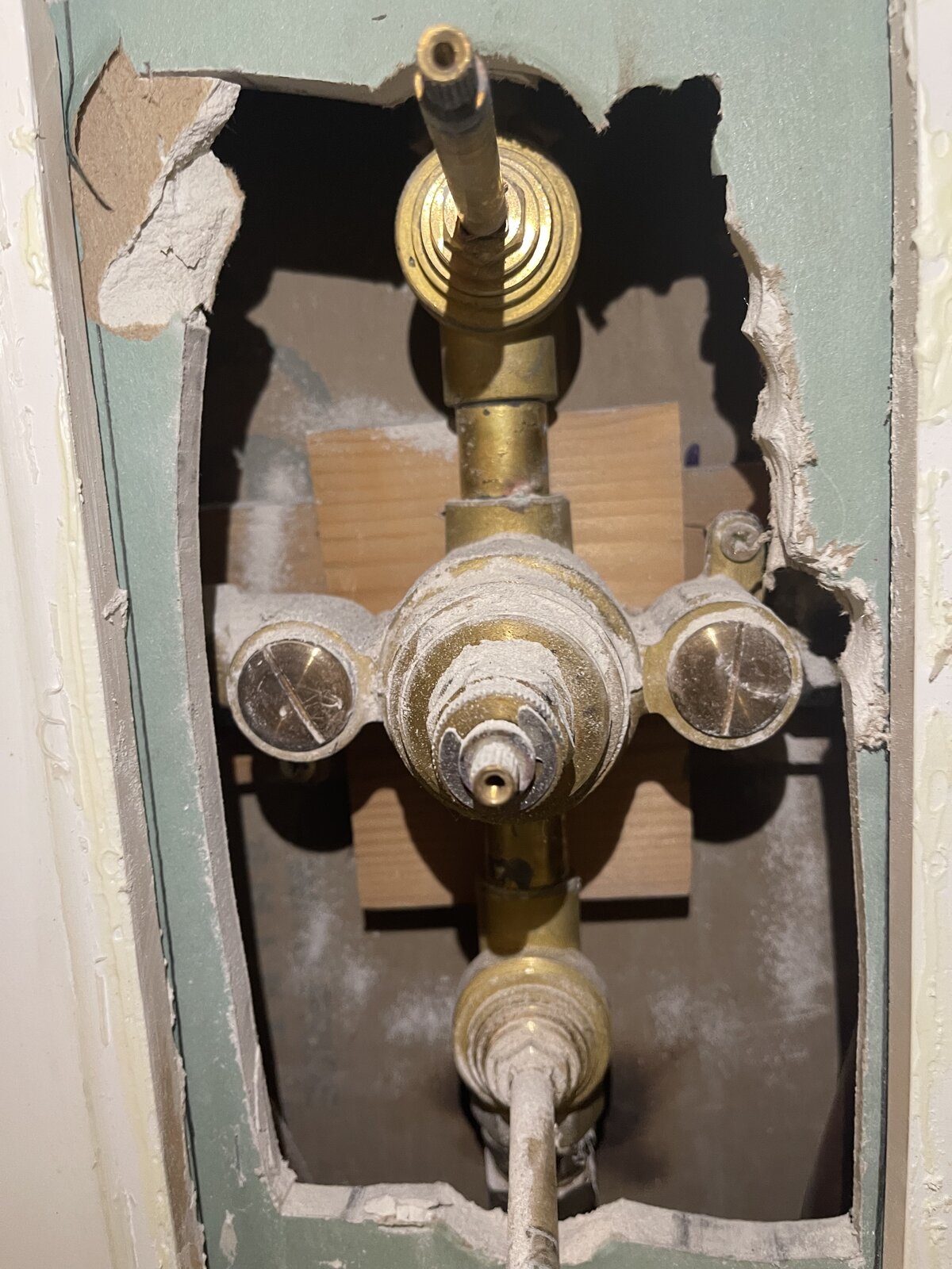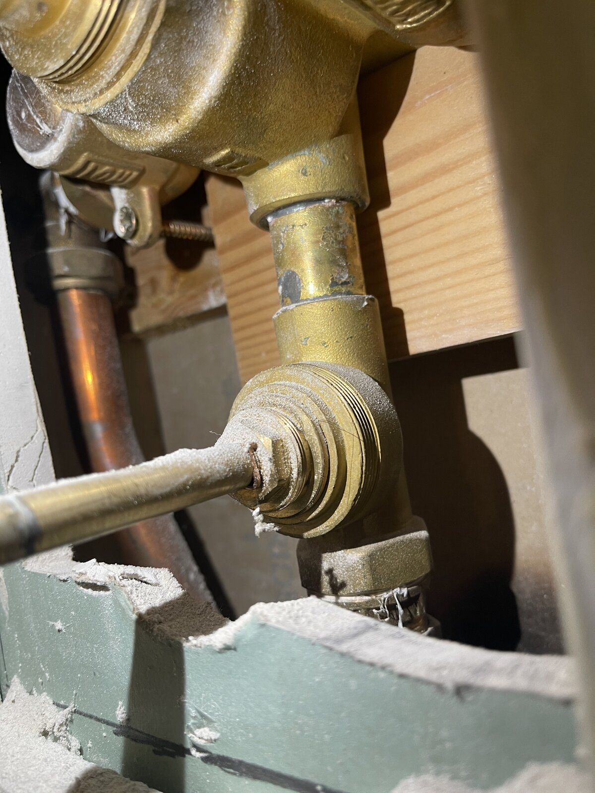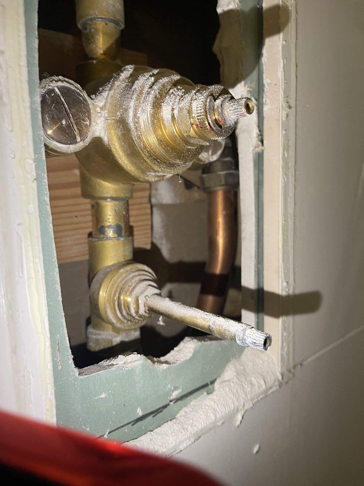 So I pulled off the plate and then drilled a hole to expose what I hope are the isolation valves. I can then isolate the defective shower, remove the thermostatic valve and figure out if it’s a seal or find a replacement. Whilst cordoning off