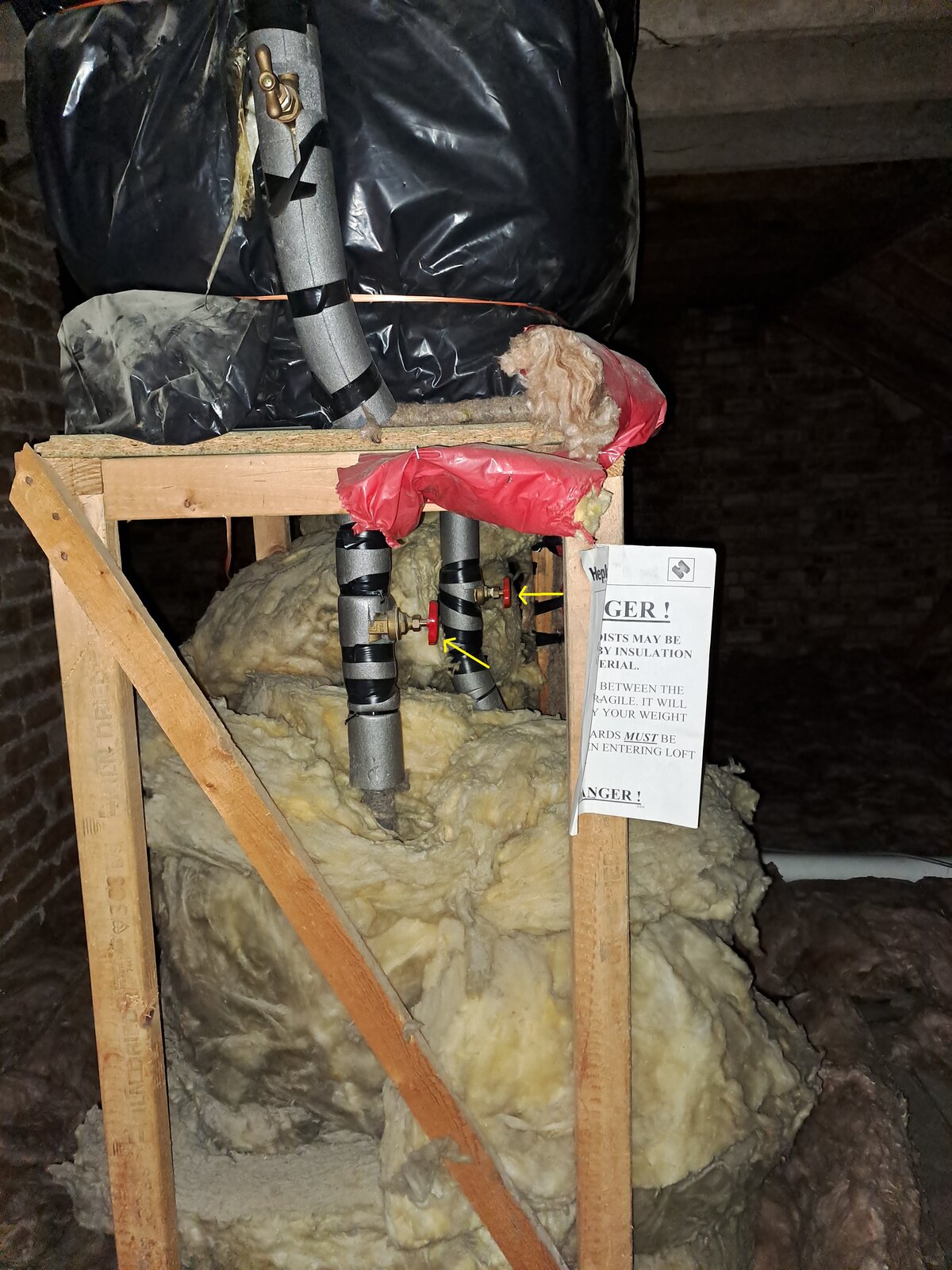 Just need some advice on what I'm looking at in my loft space. I have a water tank and hot water cylinder (actually, looks like two cylinders next to each other) in our roof space. I'm trying to turn off the hot water to do some work on our shower. I understand that I have to close the gate valve leading from the cold water storage tank to the hot water cylinder? I have attached some pictures, could someone confirm what these gate valves are? There are two of them, but I only need to close one valve? Also, it looks like there are two hot water cylinders next to each other - is that why there are two gate valves? I live in a tenement on the top floor flat. Does that mean one cylinder is for my neighbour? Or is one cylinder for my tap water and the other for central heating?