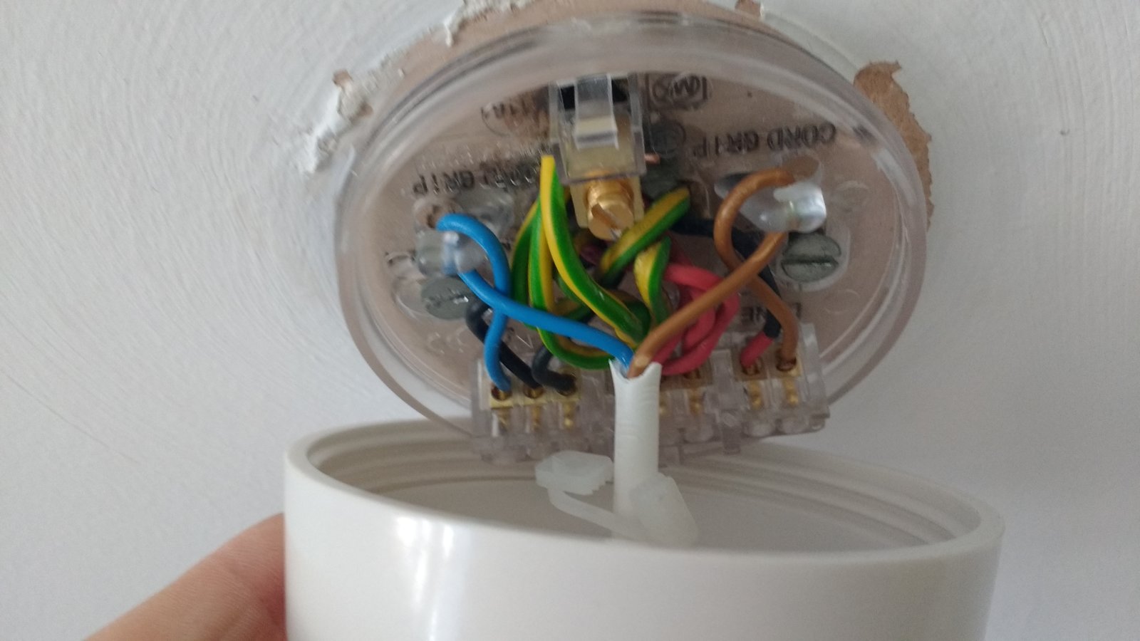 When I was checking over the other fittings looking for a brand mark I noticed that the cables were wrapped around the cordgrip a different way, and they don't have the extra cable grip tab inside the rose cover. (visible on my first 'after' photo.) The wires looked strained, and some have glass shades on which are heavier than fabric ones. So hopefully I will speed up as I do some more...The next one will take less time.