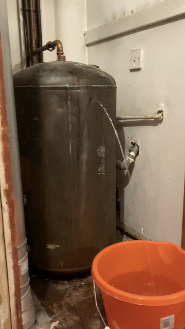 A cylinder with an electric heater element in it. Normally inside a small cupboard on the landing or sometimes in the corner if the bathroom. It supplies hot water to the sinks and bath. The cupboard normally has slatted siftwood shelving used to air out linen, etc. Not always found in modern houses but very common in 60s and 70s houses (unless it has been removed). So, how do you heat water?