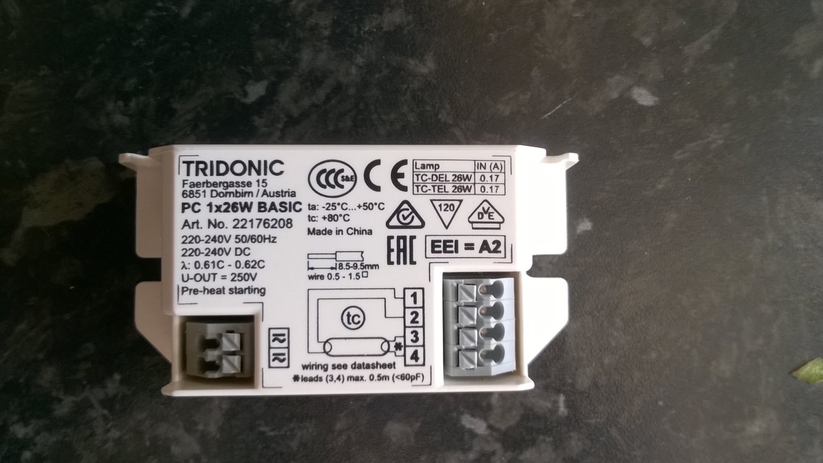 Hi all. I recently bought a ballast to replace the one in my bathroom serving a 2d light fitting. The existing (black) ballast is shown below wired up. I ordered the white one thinking it to be a straight replacement (2d fluorescent, single fitting, 26W). I did look to the manufatcturers website for a like for like swop but read somewhere that the fitting was cheap and the cause of my bulbs failing quite regularly, so i purchased this high frequency ballast. However i seem now to not have enough terminals to install it. Can anyone advise given the current installation and pictures below?