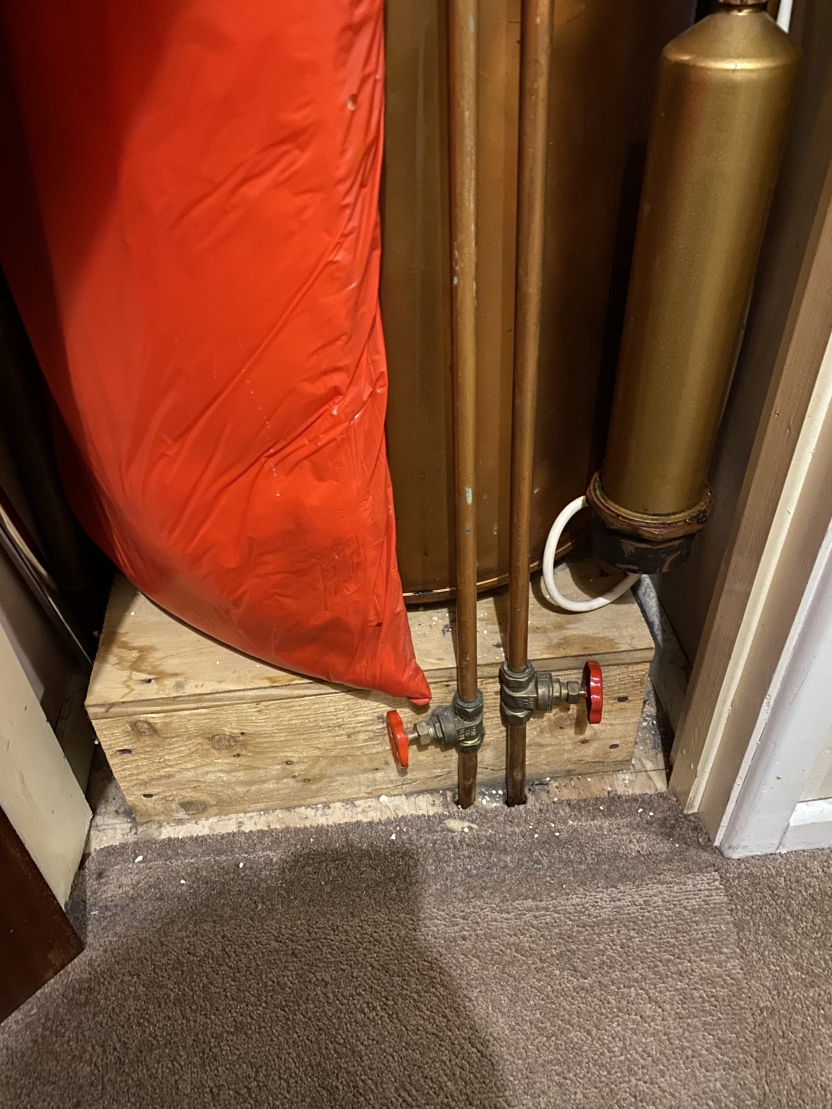 On the second picture, this pipe is coming down from the loft and doesn’t seem to be connected to the hot press tank at all, it runs from loft straight down through the floor boards, again their is a valve on it but this is fully closed. Tonight when the pipes were banging like crazy after I pulled damper out from having fire lit (no oil heating on) I have to confess that I opened this valve and heard water gushing down it from the loft and the pipe became scalding hot so I quickly closed it again incase I do any damage. So clearly the fire is heating the water tank in loft, but I’m confused as to why this water is not making its way to the taps?