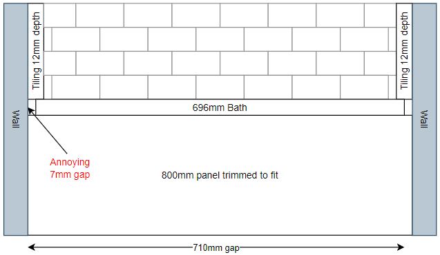 But I'm struggling to work out what to do about the 7mm gap at each end when viewed from the front. I'm considering buying a 800mm panel and trimming it down to 710, and make the best of it that way (see attached image), is that my best bet? This would leave the 7mm gaps either side of the bath itself above the panel height to fill, but just white silicone it?