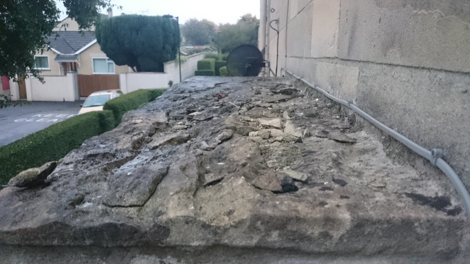 Fast forward to last week… we noticed the patches of damp is back and defiantly happened within the last 2-4 weeks as it wasn’t there when I put in a new light bulb, it was raining pretty heavily as you know in the UK. I got the ladder out and had a look and I think the some of the “new” mortar is coming off and there are a few pools of water resting on top.
