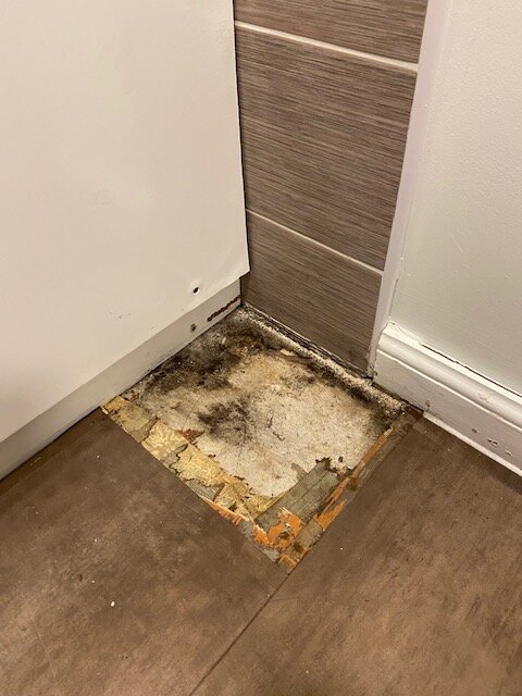 Because of this, water has been dripping down the side of the bath panel and has been getting under the floor which is made up of vinyl tile. I noticed that it started to lift away from the floor and has damaged the skirting board. I've since removed a section of flooring and can see that it has penetrated the subfloor (see attached photos)