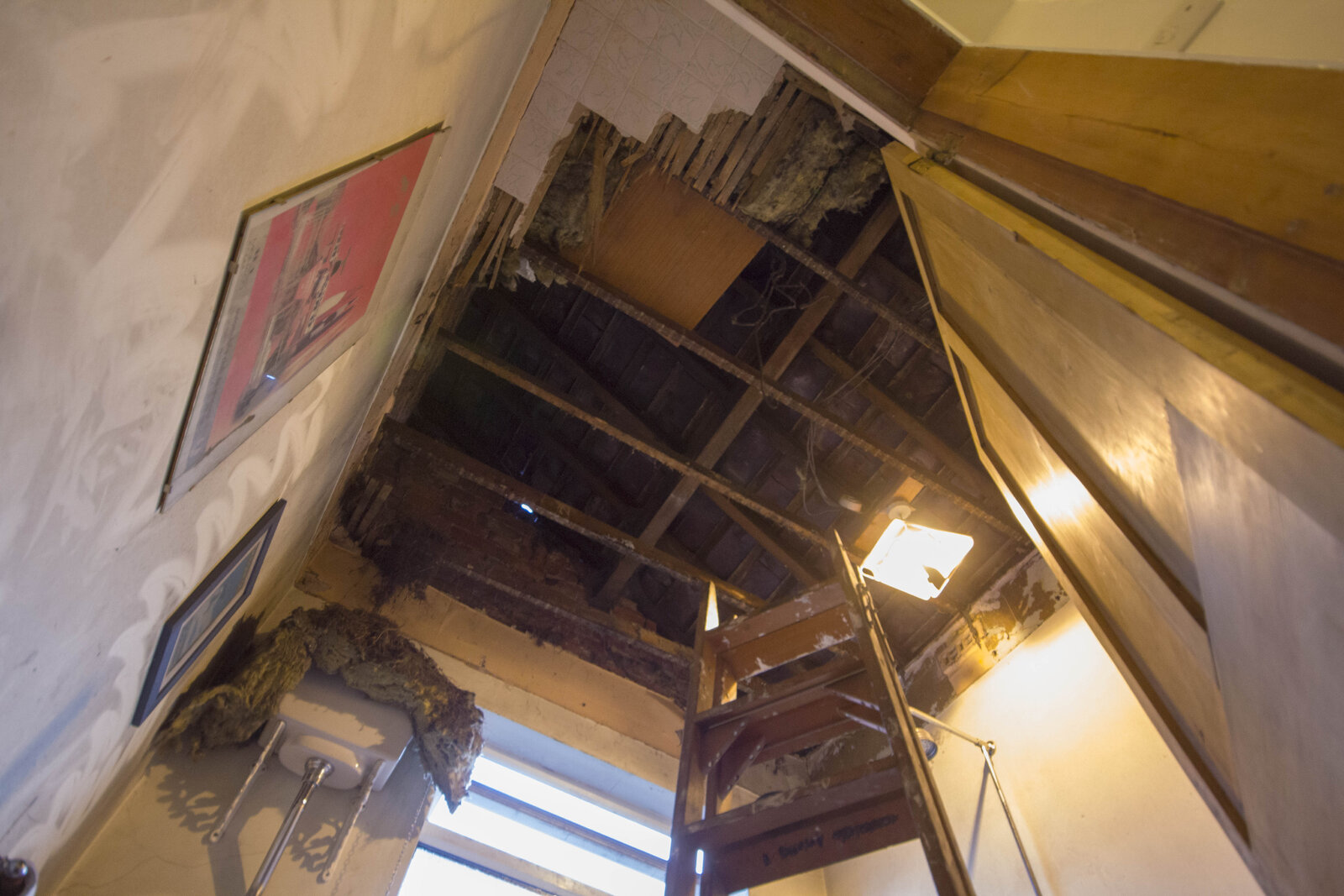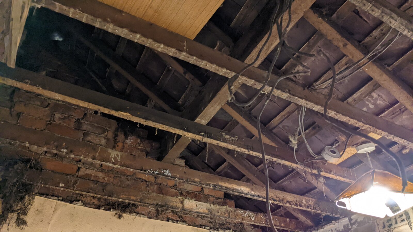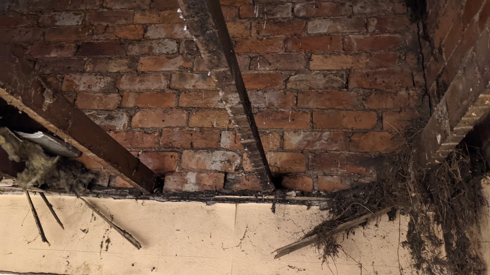 This is the party wall between the two houses in the picture above. The ceiling joists are currently secured (not very well, some are very loose) between bricks.