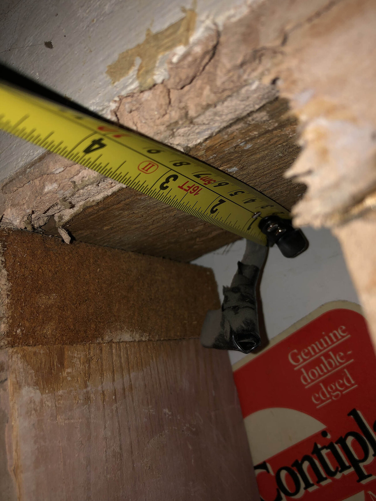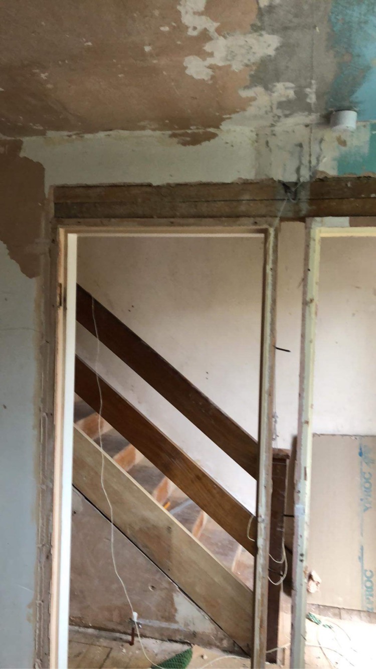 I wanted to replace the downstairs bathroom door in my 1982 split level terrace with a single pocket door system. Upon stripping the adjacent wall I found a second door frame from when this was two separate rooms (with the door still in situ - plaster board over one side, tiled over the other - don't you just love the 80s?)