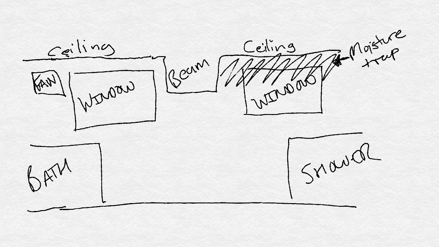 We have a bathroom fan wall mounted and recently extended out bathroom. I upgraded the fan to cope with bigger room but my problem is where the room is extended in the centre where the support beam is is slightly lower than ceilings either side and where the shower is located moisture gets trapped. (see rough drawing attached).