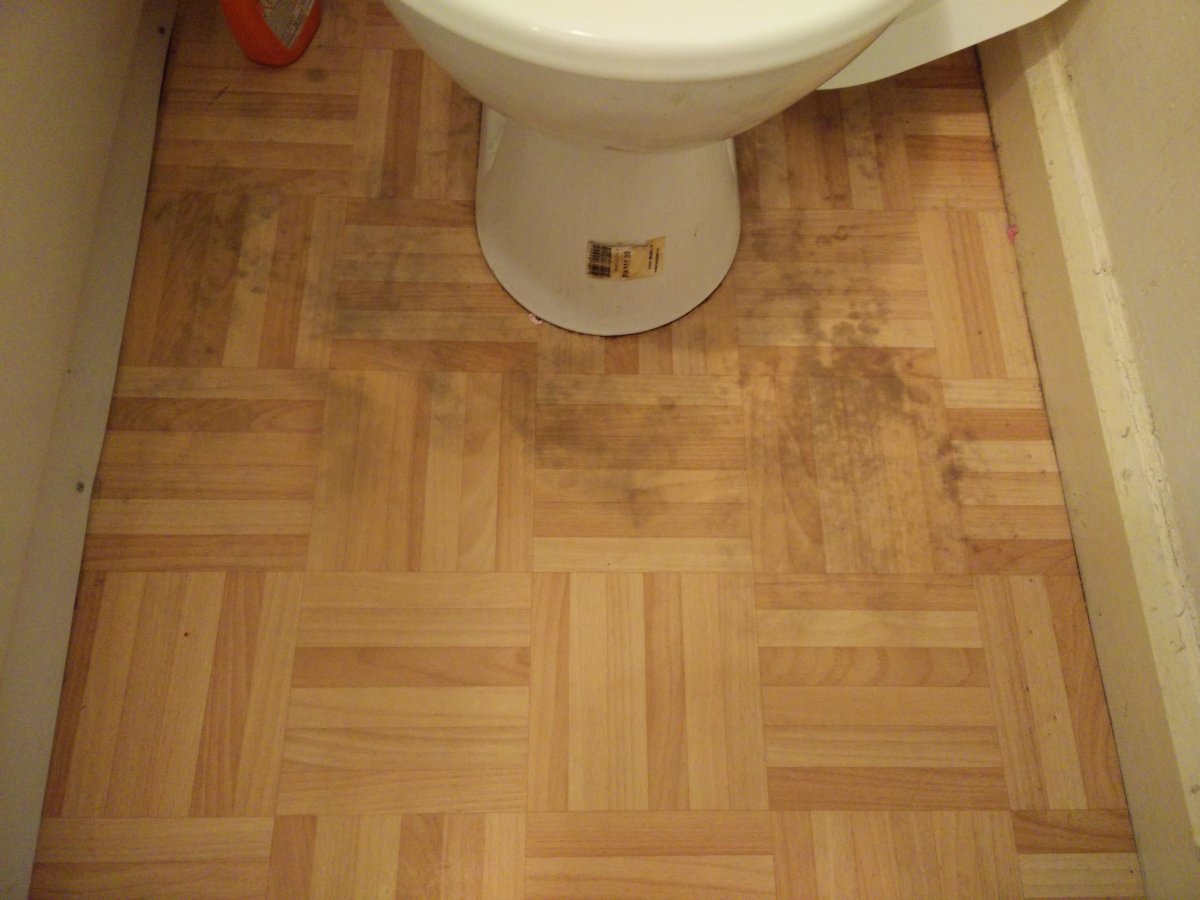 Hi All, the rented flat I have moved into has some issues in the bathroom, in that the area was covered under the rug has gone mouldy with discoloration visible on top of the floor laminate sheet. I have now removed the rug to let the wood underneath get dry but this has left it looking unappealing to say the least. (picture attached)