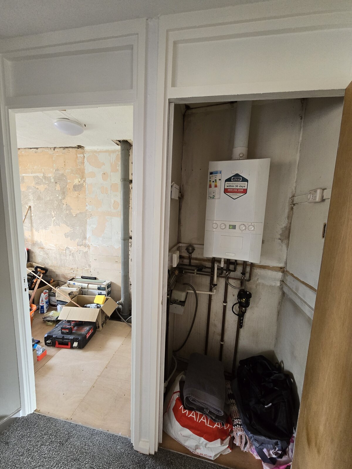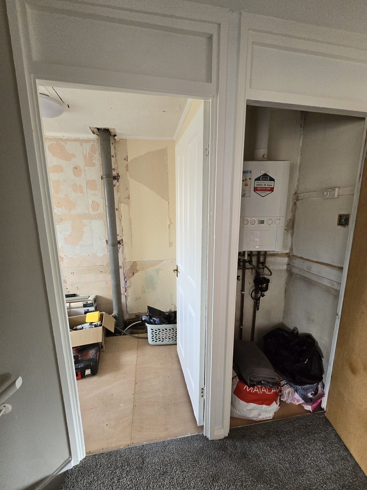 Another reason for getting rid of the cupboard is that the boiler is mounted to the thin eggbox wall and resonates through the whole house when running, we've got used to it so not a big problem but would like to move it to the wall at the back of the alcove which would become the bathroom and be in a built in cupboard for access OR move it to the attic directly above, need opinions on this especially.