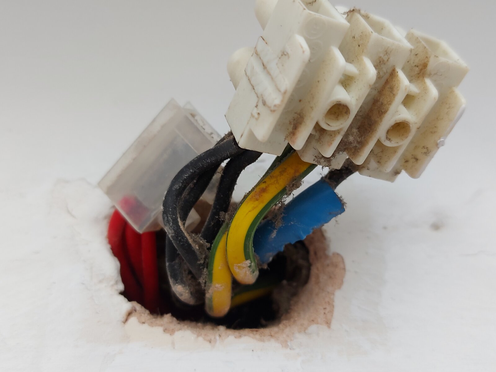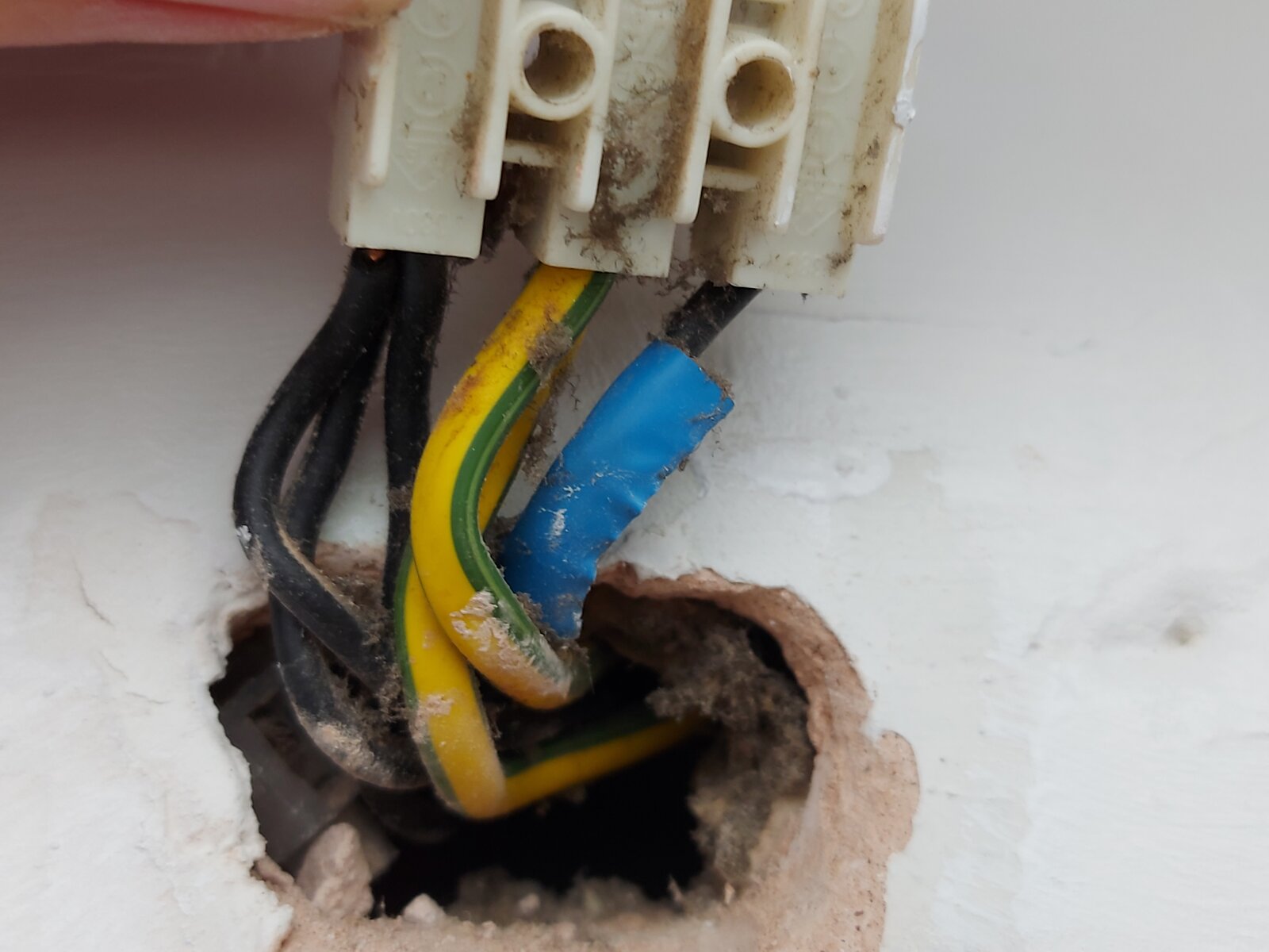 So I've taken off the old bathroom spotlight which was connected to the black, blue & earth wires. That's the first image. The red wires in a block were tucked away in the wall and not connected. That's the second image.