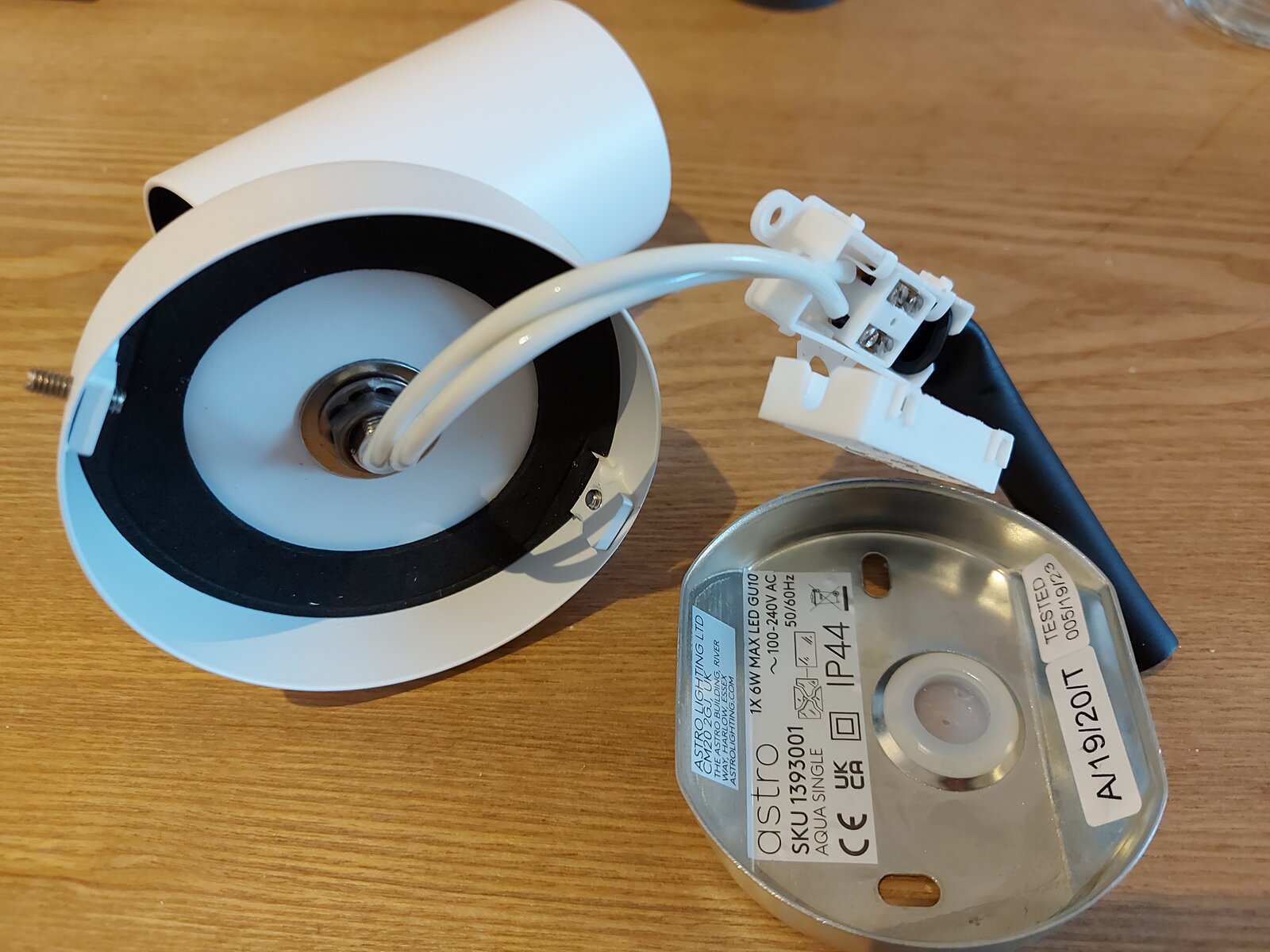 The new light fitting is a Astro Aqua single spot which is ip44 and double insulated. That's the third image.