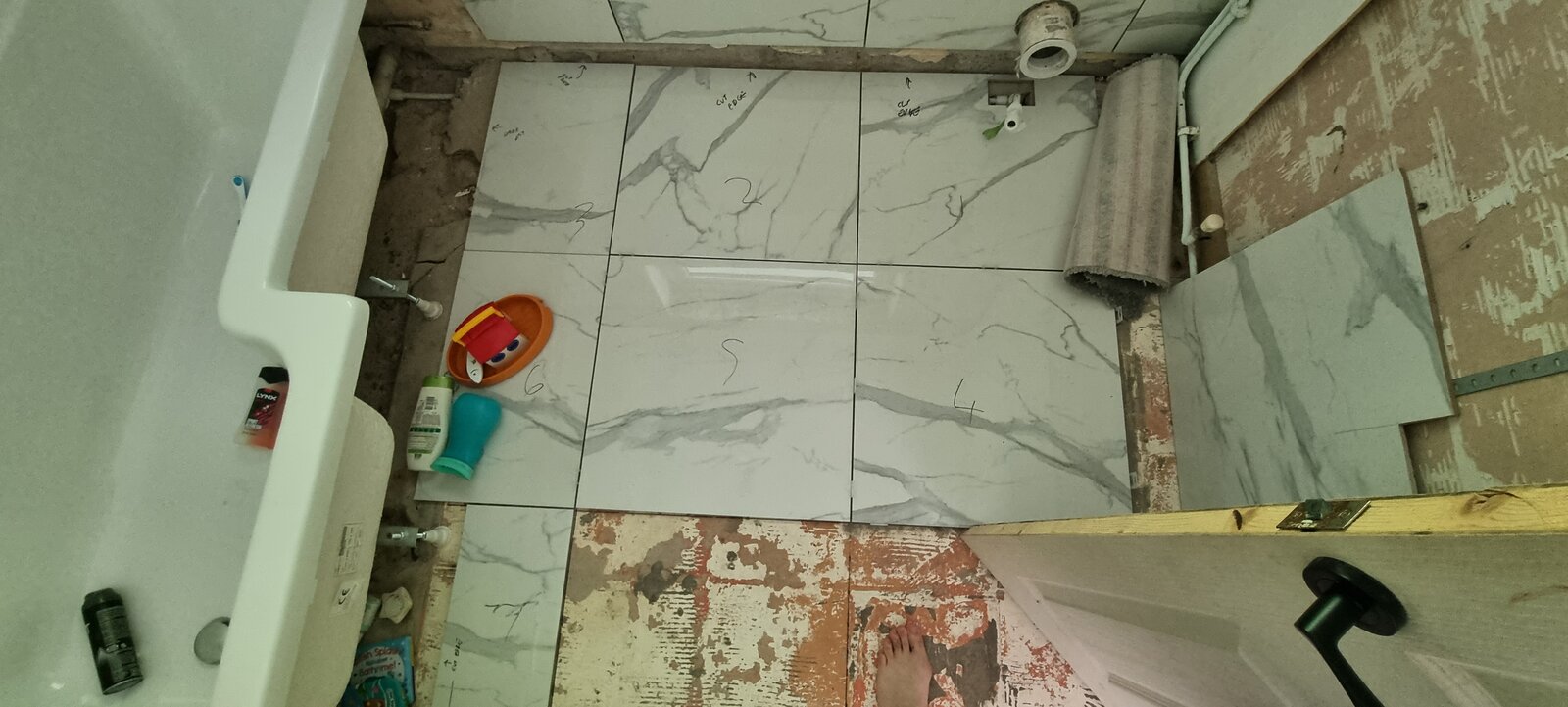 My thinking is to replace the tiles on the floor with larger tiles. Installing an L bath and using the electric shower only.