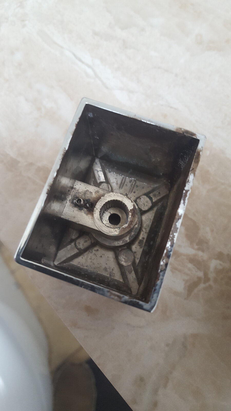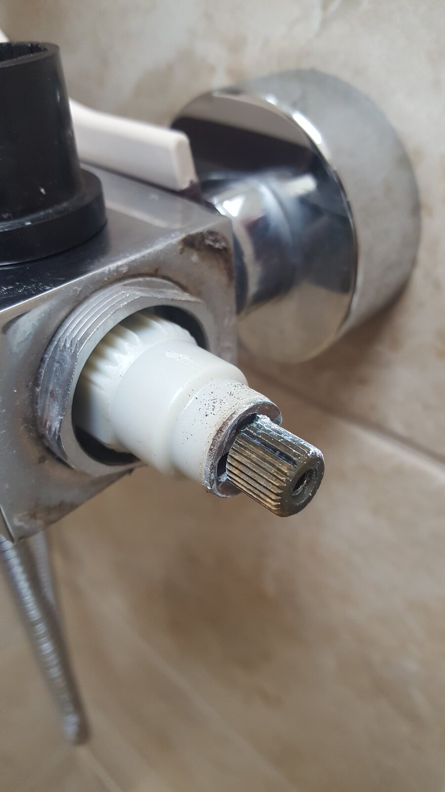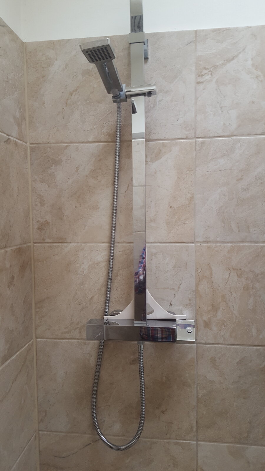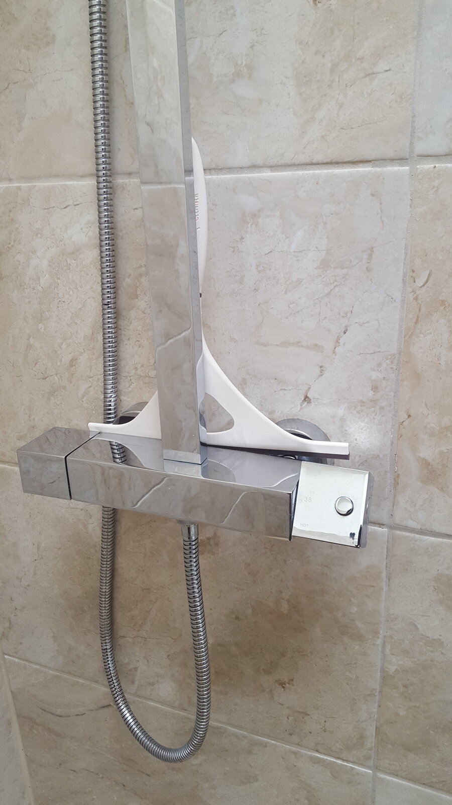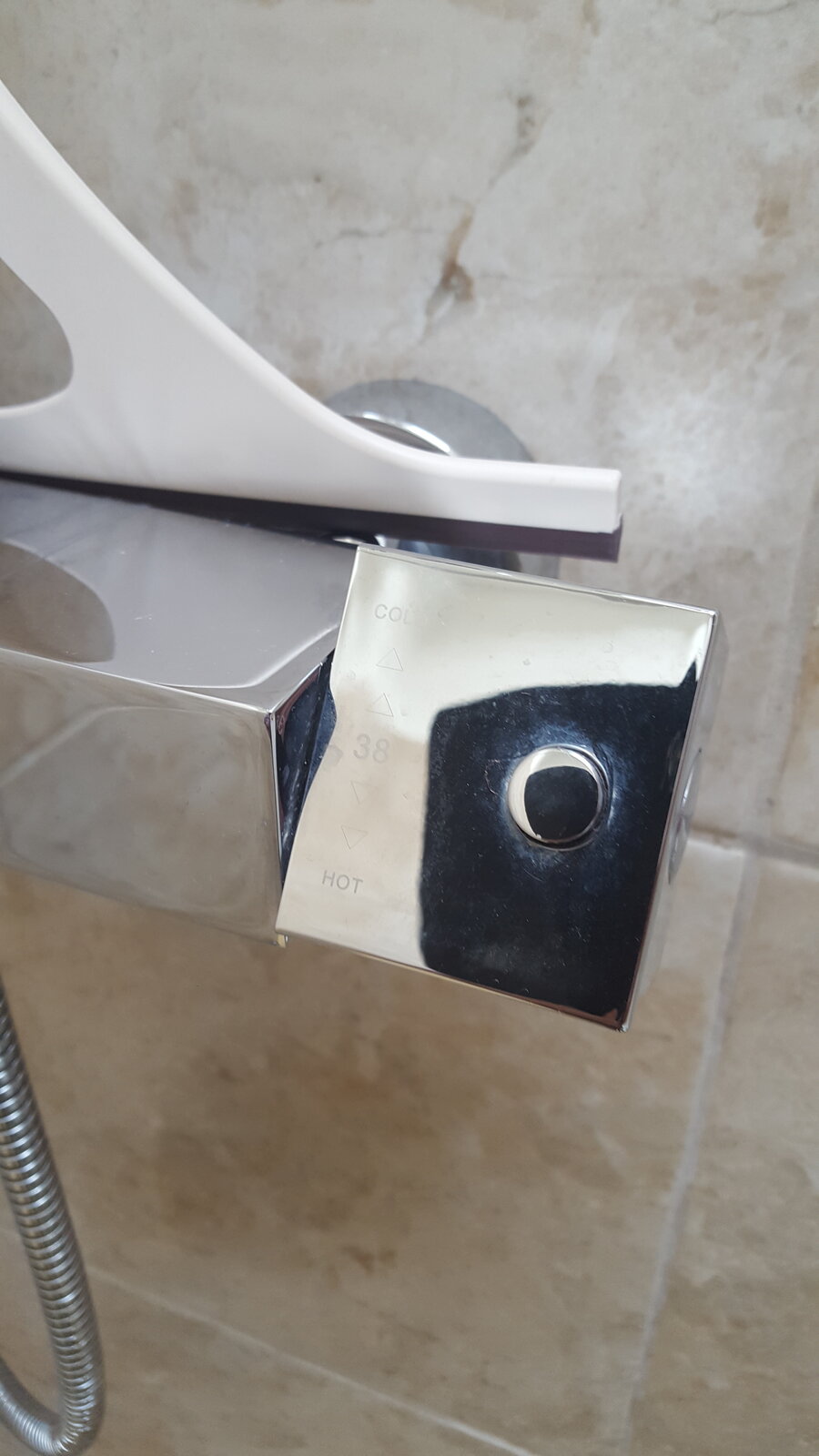 We recently moived into this house and this is the shower unit installed. Can anyone identify it? The temperature tap on the right hand side appears to have been put on at an angle as it doesn't square up as I would expect - when it's on fully hot it is at an angle. Also on the temp control knob there appears to be a release button to keep you from scalding yourself but it is either stuck or purely decorative - I tried with some pliers to gently move it but it doesn't seem to want to - does that head simply pull off? (can't see any grubscrew or anything).