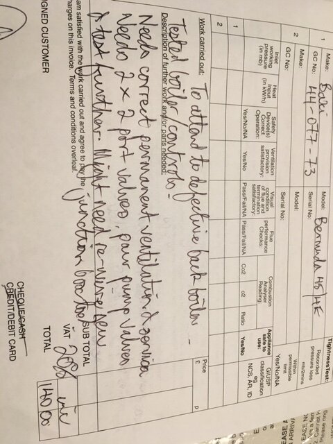 I know I was ripped off because the engineer said my air vent was insufficient, but he didn't take account of the room being open plan to the kitchen and the 2 additional air vents there. After confirming this was a requirement for the boiler only I wanted to double check it was still safe to use my gas fire - he said you won't be able to as I've turned the gas off to the fire. Gas safe have confirmed this should not have been done without my consent unless it was thought dangerous, he wouldn't have even mentioned it if I hadn't commented. I think he was trying to force me to have him back but as I have an immersion heater and I've bought some electric panel heaters to keep warm now the fire can't be turned on I definitely won't be. I'm counting my lucky stars that I didn't pay him to do the HW motorised valve. I should be fair and say the quote was for both M. valves and he said the current pump valves are "not the best" so that was included even though both are operational, he also said a service would have be included in that price, it was rolled up as a total price so I don't know what the breakdown would be. He left his reading glasses at his previous job so spent much of the short time ringing his office to arrange to collect them after finishing at mine. I was working from home downstairs so didn't see what he tested upstairs. After I googled the motorised valve I checked it would move manually, which it did, so I tried changing only the head which didn't help, then changed the whole thing, which again didn't help.