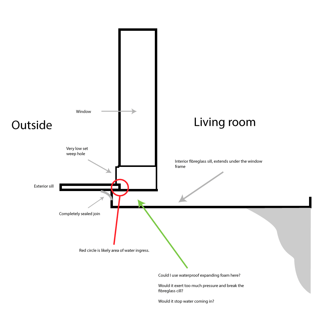 My question is A. Could I, as an added measure use waterproof expanding foam under the window (in the small gap between window and sill) ? see pic.