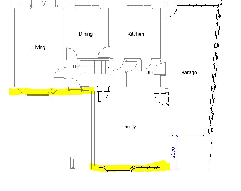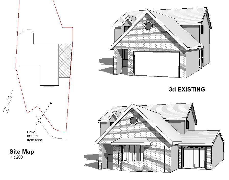 I want to apply for a Lawful Development Certificate for this project. I'm looking for some advice. I'm confident(?) that the garage being less than half the house width and less than 4m high will be OK, but I'm not so sure about the proposed bay window where the existing garage door is to be infilled. Would a bay window with brick base need planning? What if it was a bay window without a base? Could I have just the window with a canopy over? Or being the principal building line, can this only be a flat window?