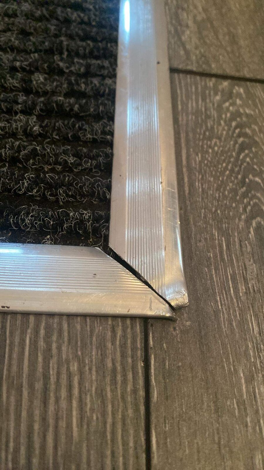 Brass is stronger than ally, it never dented in years, and goes as dull as you let it, or not. Mitred when tilted to the right angle, on a chop saw.