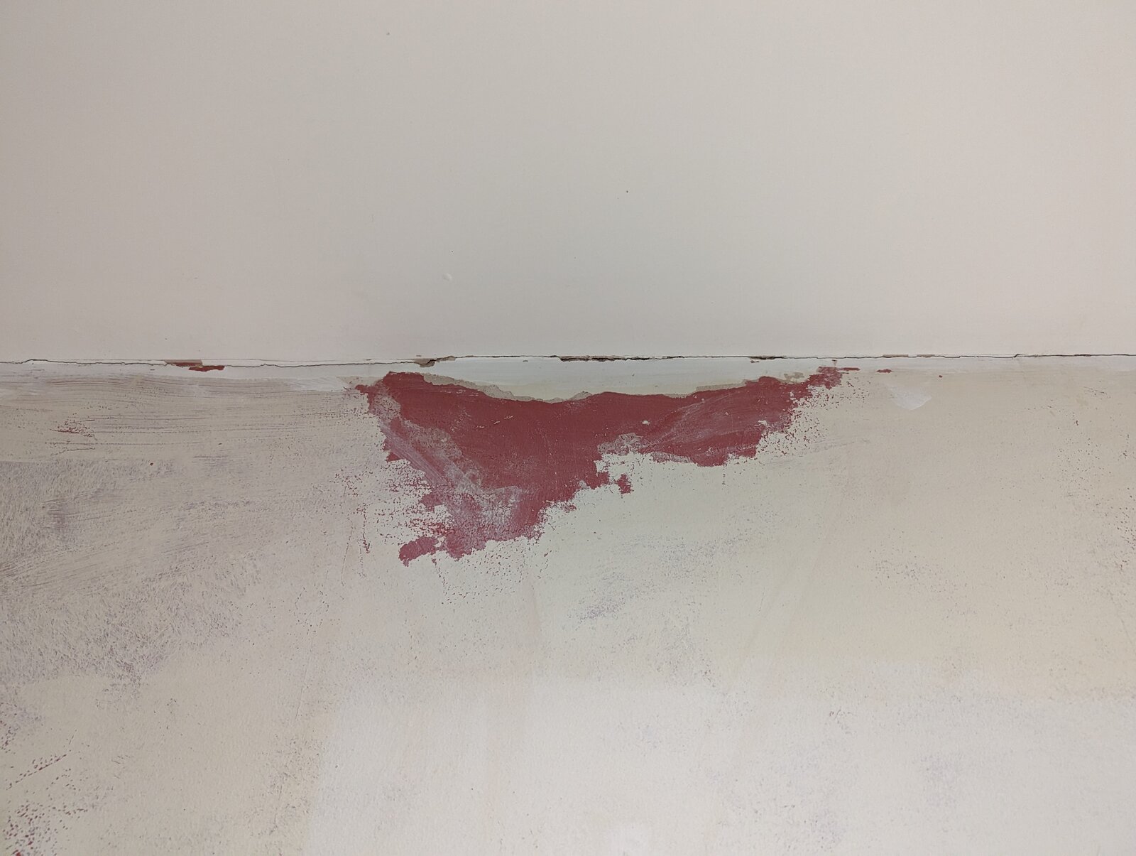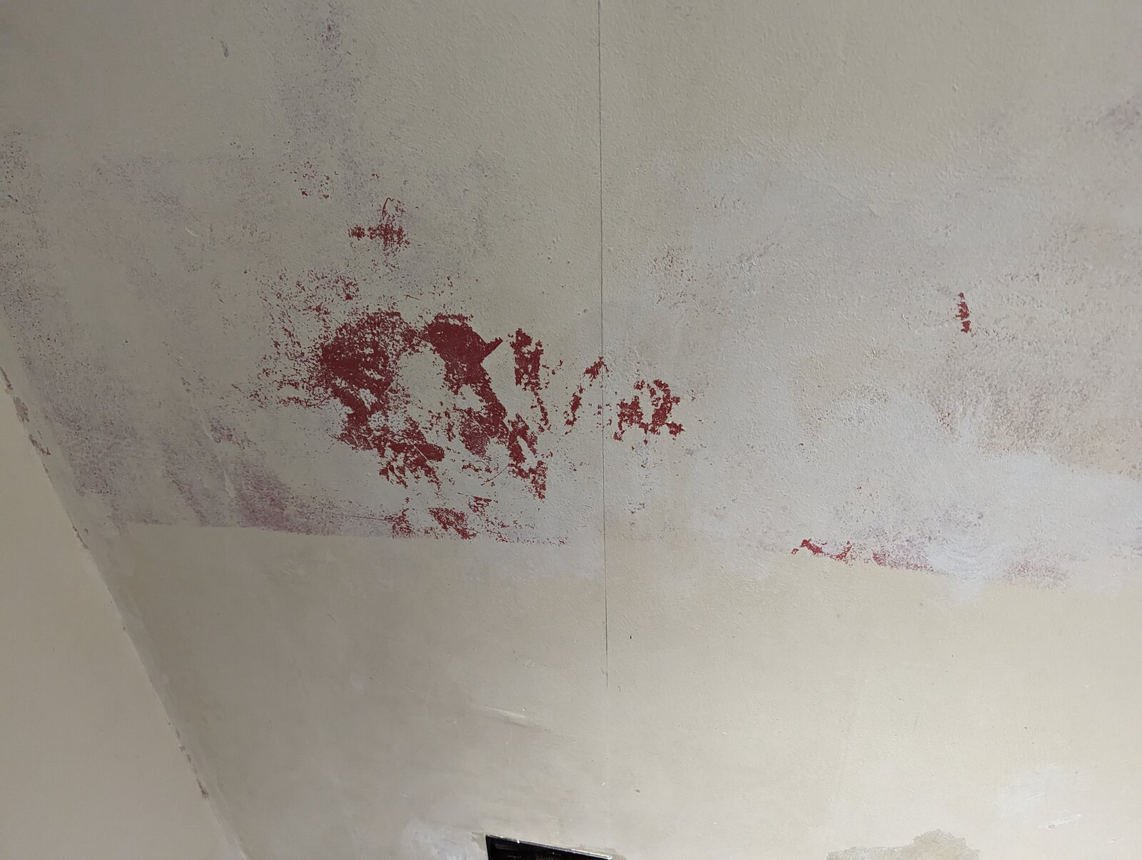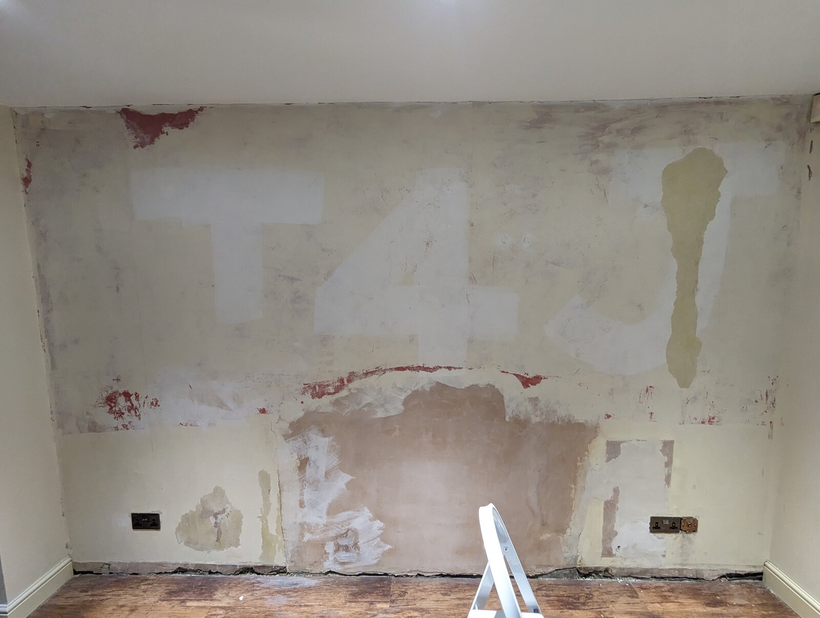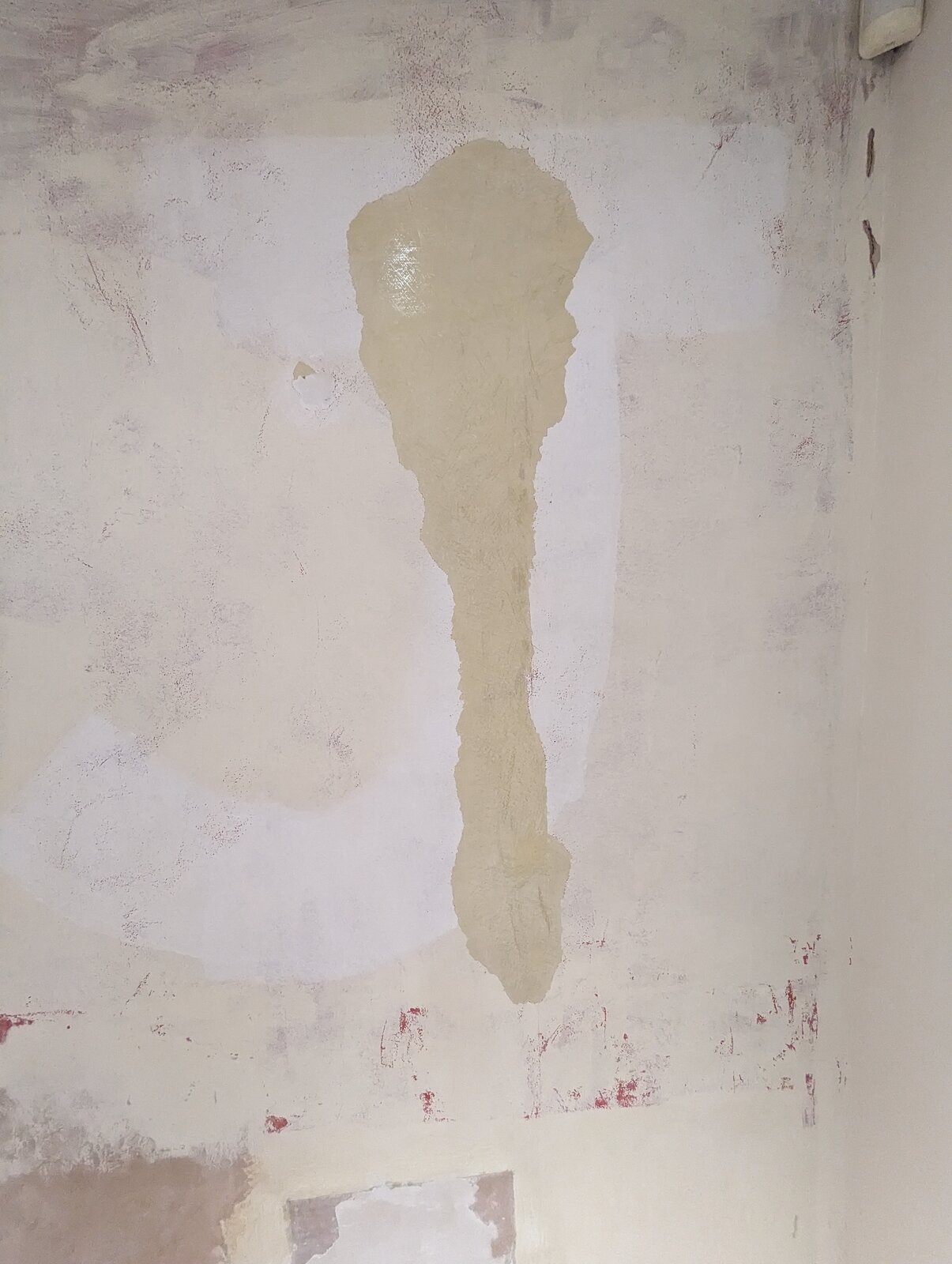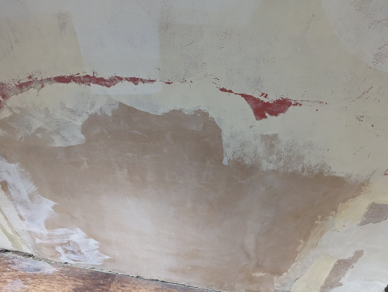 I've attached photos. There's a bit that's relatively recent plaster where they've filled in the old fireplace I believe. Elsewhere there seems to be combinations of a thin paint layer, a red thicker older paint (?) layer, and an old plaster layer (yellowy rather than pinky like the newer stuff). That's my guess anyway... I've scraped off where it looked flakey and from there outwards whatever was easier to come off, so have removed the worst on the right hand side and a few other smaller spots. It'd be a bit of a job to continue and do the full wall to that, the rest seems better adhered to.