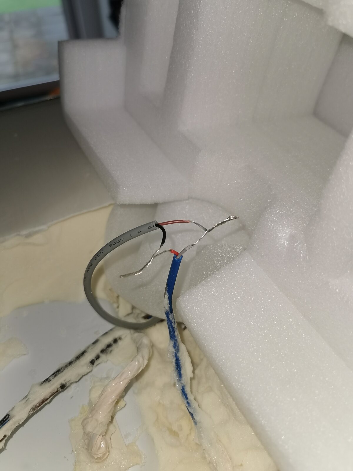 I stuck the new thermostat sensor (part AP930X) in a punched hole between the insulation and top of the plastic fridge encasing highlighted by the orange dot in pic 1. I've snipped the existing wires of what I believe is the old thermostat and attached the wires per pic 2: existing orange to black new, existing grey to brown new temporarily (hope this is the correct polarity) as a test to see if the fridge starts cooling.
