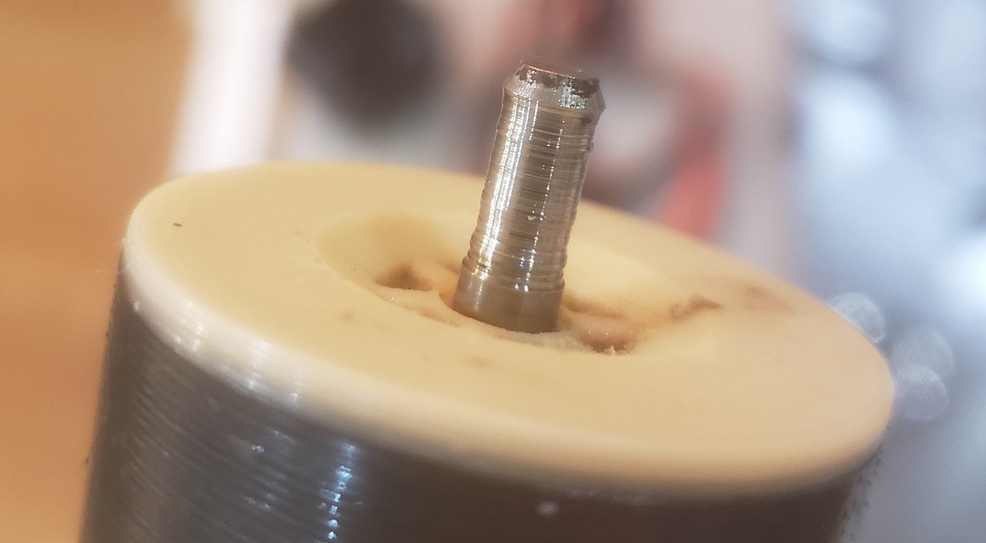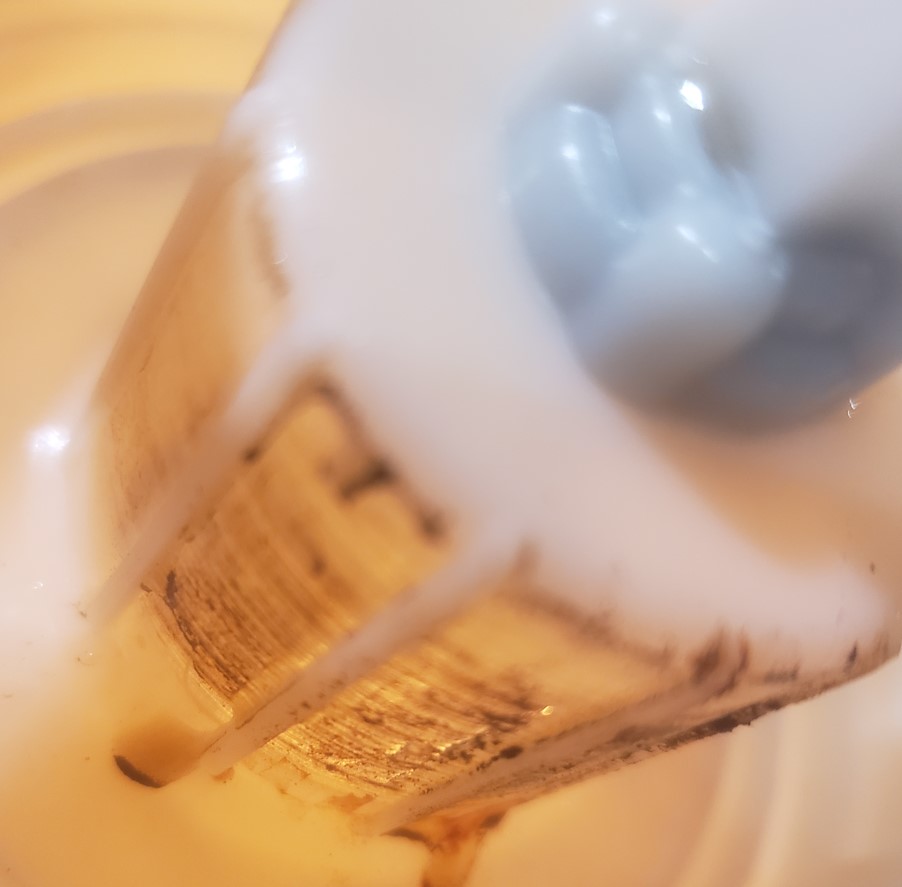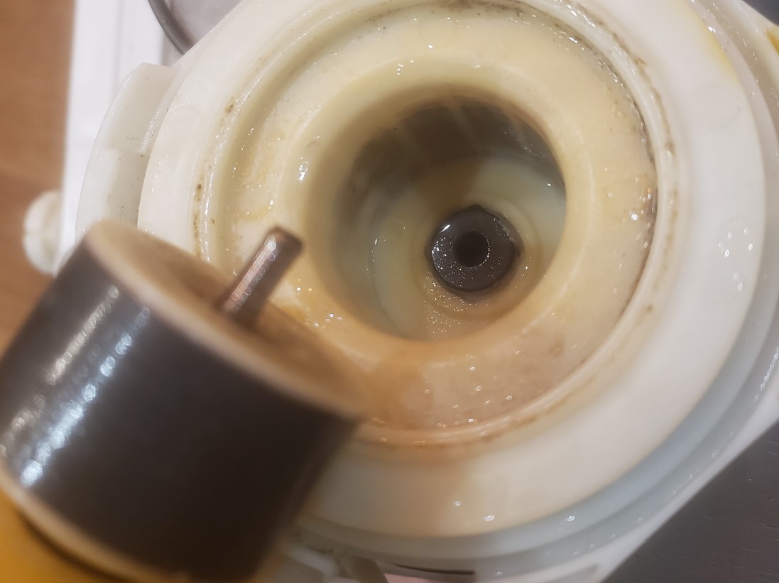 Holy crap! At least one of the plain rotor bearings has visibly worn away, the rotor has touched down on the inside of the plastic housing and has ultimately machined its way through the plastic to create a leak path into the stator area - pretty serious!