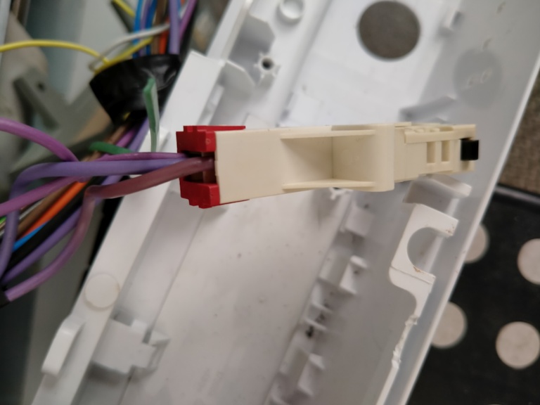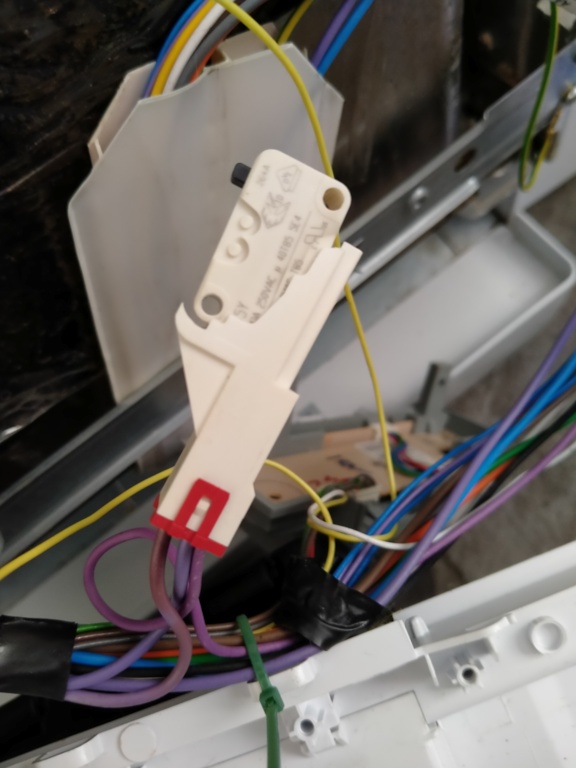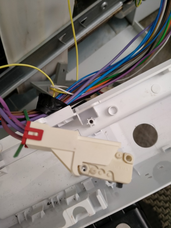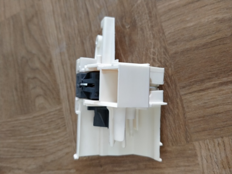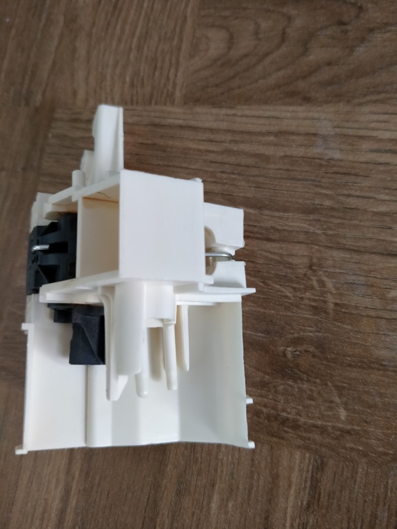 I have purchased a replacement facia as the plastic handle had cracked. All the other parts screw on perfectly apart from the door switch, which fits onto the door latch so that it closes tightly. It seems that there is a spring that needs to be pulled back, but I cant seem to be able to do that. I have attached photos. It the grey part that houses the spring.