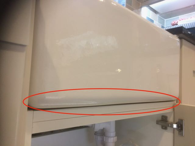 However, when water drips over the outside edge (children!), it trickles down on the outside and instead of dripping down on the floor it creeps in-between the sink and the cabinet (marked area in picture below).
