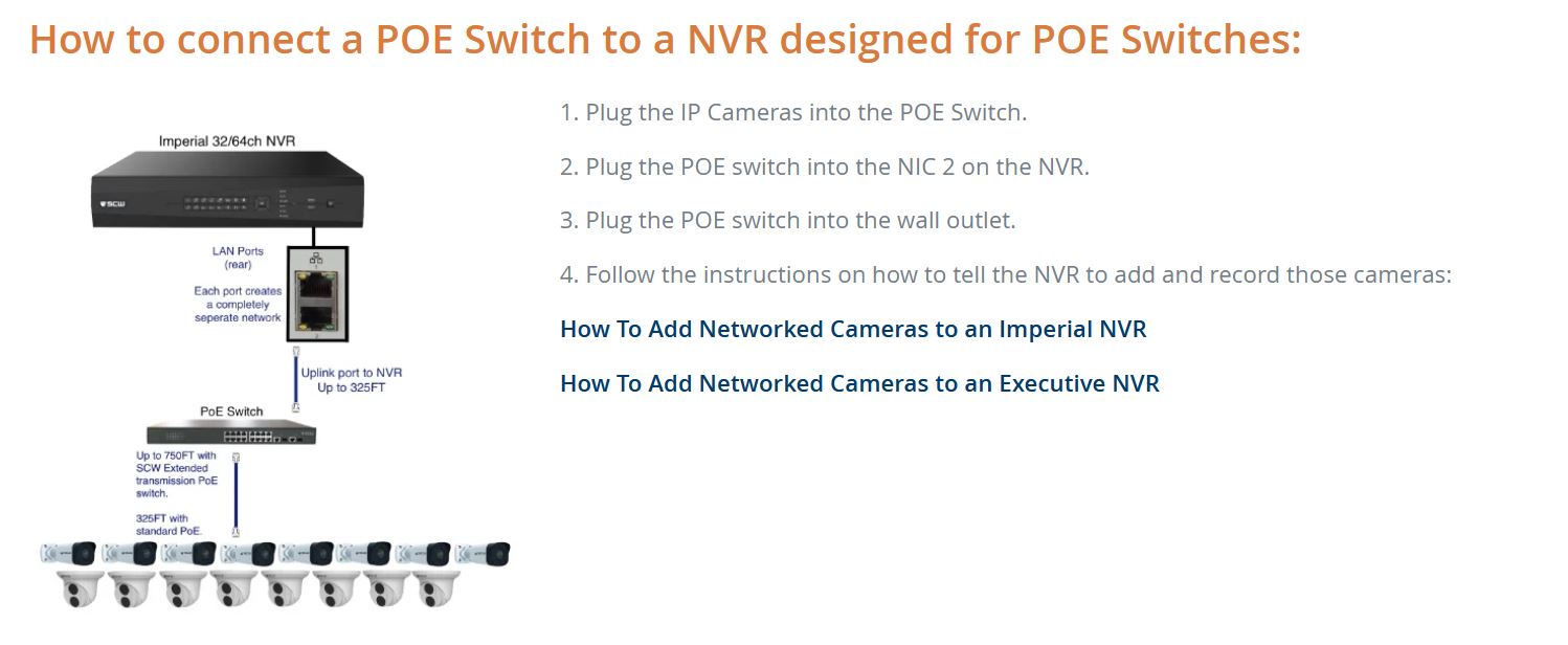 You ask - Would the POE cameras not plug directly into the NVR? Well they could do, but it’s more elegant if you can run all the cameras to one switch if the physical geography allows. - Maybe a PoE NVR would be useful? This question is associated with what route your cables will take. I attach a picture of all the cameras in a setup going to one switch and then from that switch to the NVR. I would start looking at what kit you are considering and what the best physical cabling for it is, given its requirements/spec.
