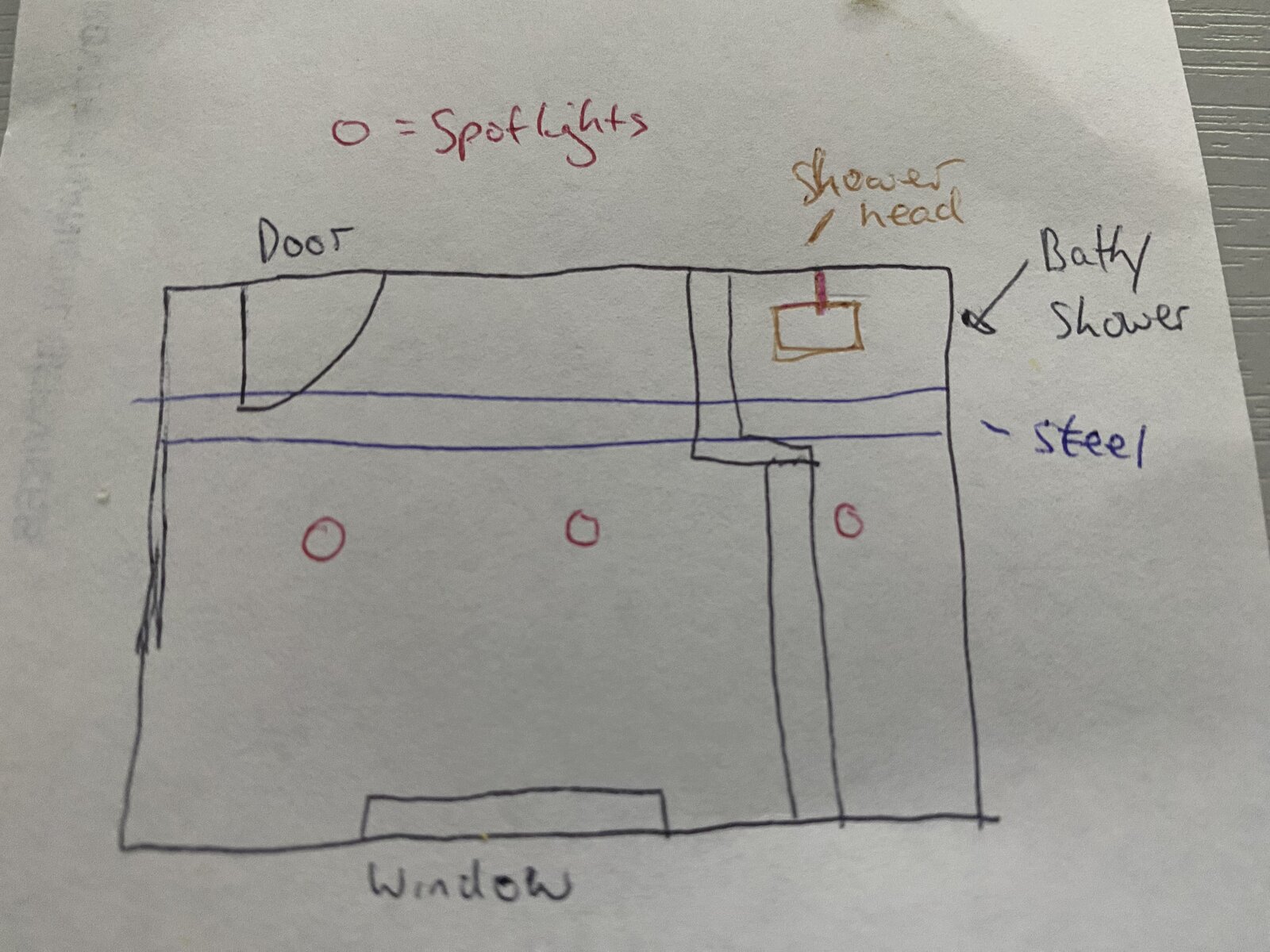 I’ve attached a drawing of the layout. Wary I don’t want it between the spotlights as it’ll look odd. But the steel from our loft conversion could be an issue as well. The roof slopes down to the window.