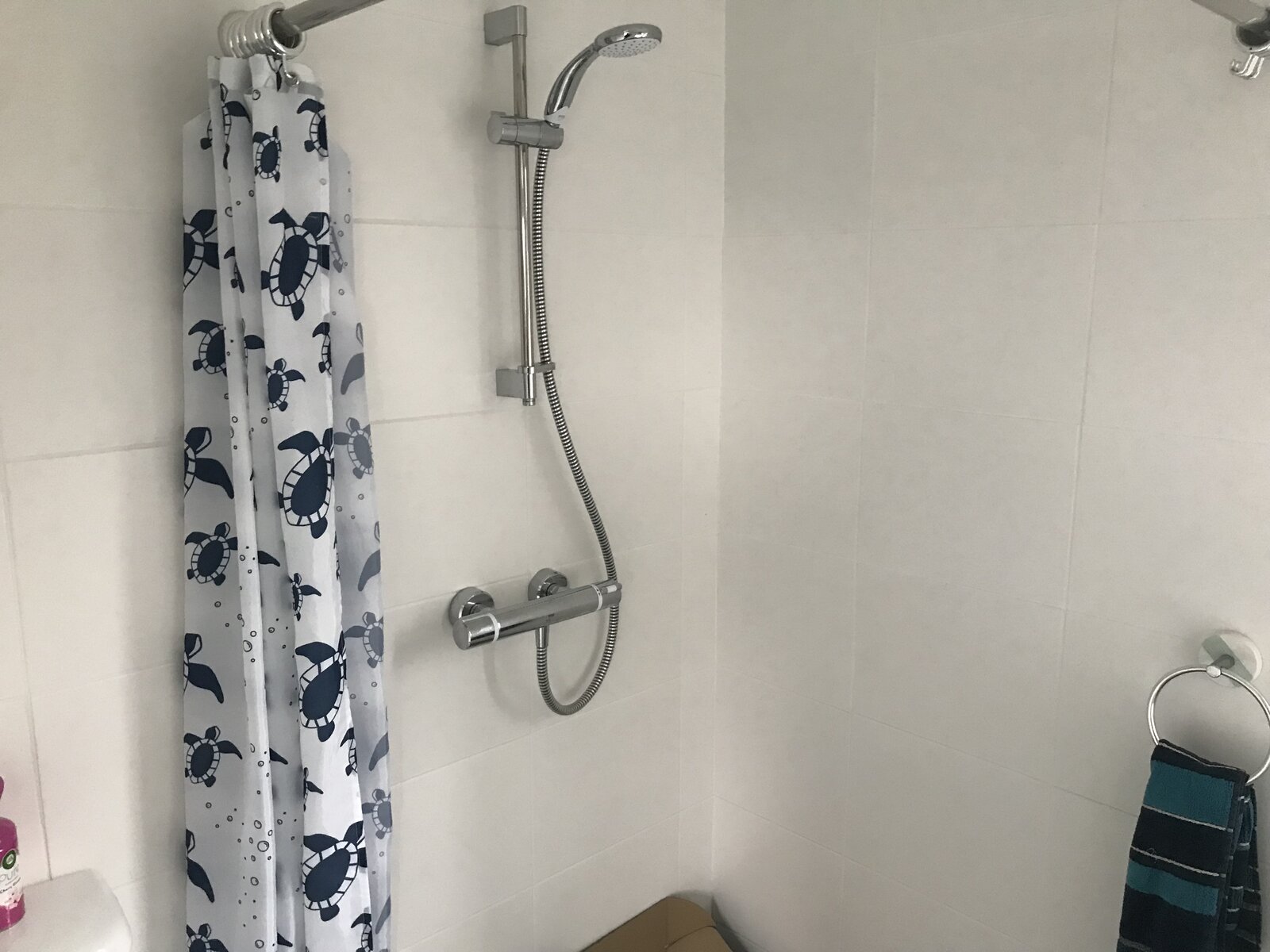2. The shower is over a wet room and is far too powerful for the room. ( often floods out the door if curtain not situated effectively)