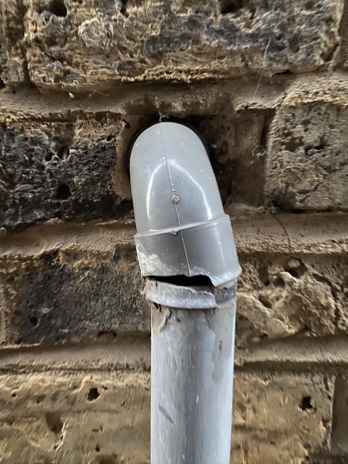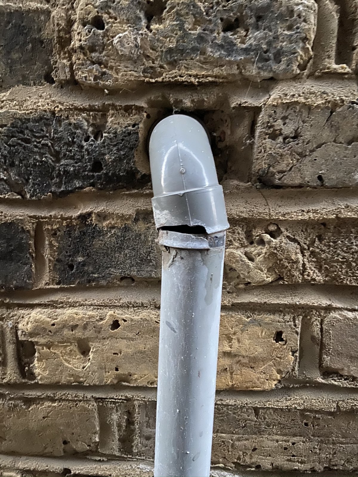 Simple fix. Replace that entire section through the wall, from the trap. Cut a short piece off the existing vertical pipe, fit a coupling, piece of pipe required length, new bend, and a section through the wall, cut as required to meet trap outlet.
