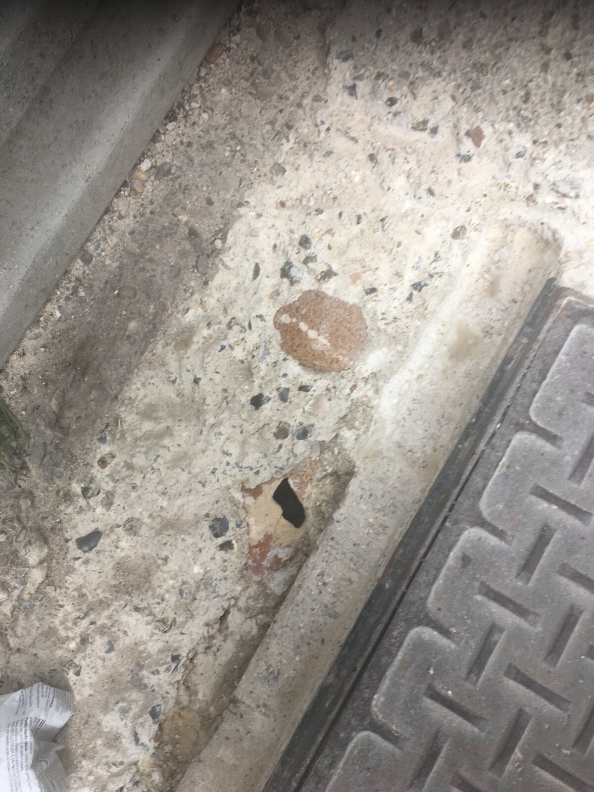 Was shaving off a concrete path with a manhole to recess it and unexpectedly hit a rain pipe diving near vertically along the outside of the chamber, elbow bend, straight bit, elbow and over the soil pipe encased in the path.