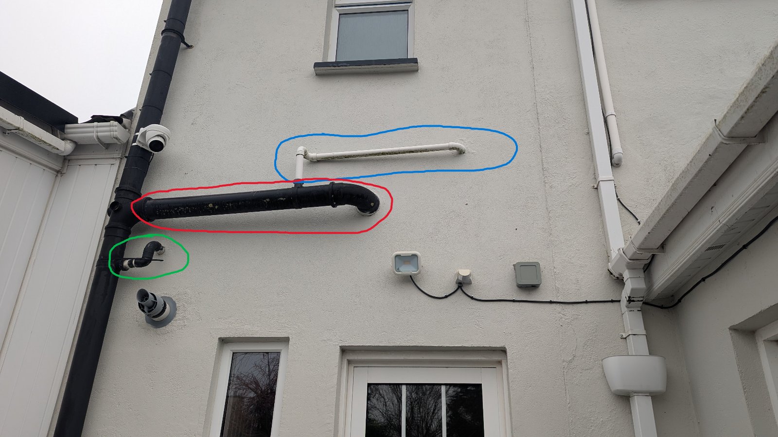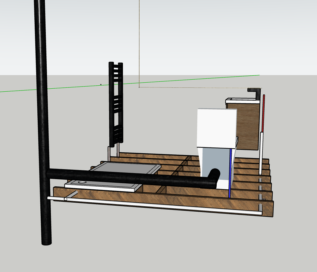 I'm renovating an ensuite bathroom and would love some advice on how best to route the waste pipes. The existing set-up is in the photo attached, where the Green marker is the current shower waste, Red is obviously the WC waste and Blue is the existing basin waste. This room is a 2nd floor side extension to the original house (the original house stack is boxed-in and the main bathroom and kitchen drain into it). I'm guessing whoever did the original plumbing put 2 x 90° elbows on the shower waste to attempt to stop backflow given the WC waste drains from above it (We never really used this shower so can't confirm if there were issues or not with it).