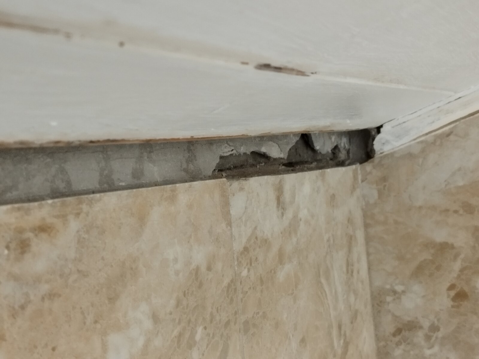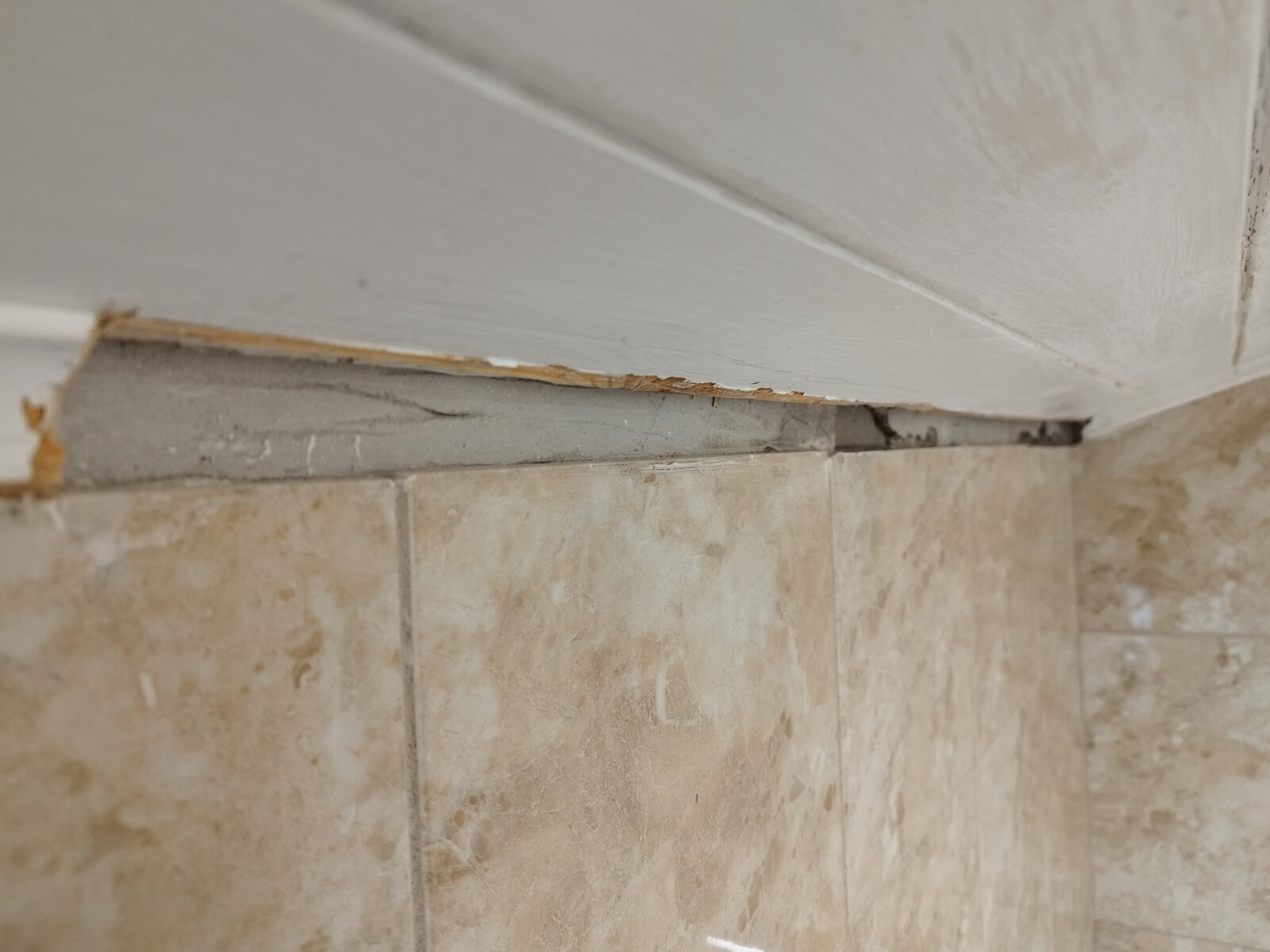 I removed a bit of beading to replace it. Behind it i found it stuck on top of broken bits of ceramic tiles with copious amounts of caulk. The gap behind it is 20mm deep in places, what's the best option to reattach it?