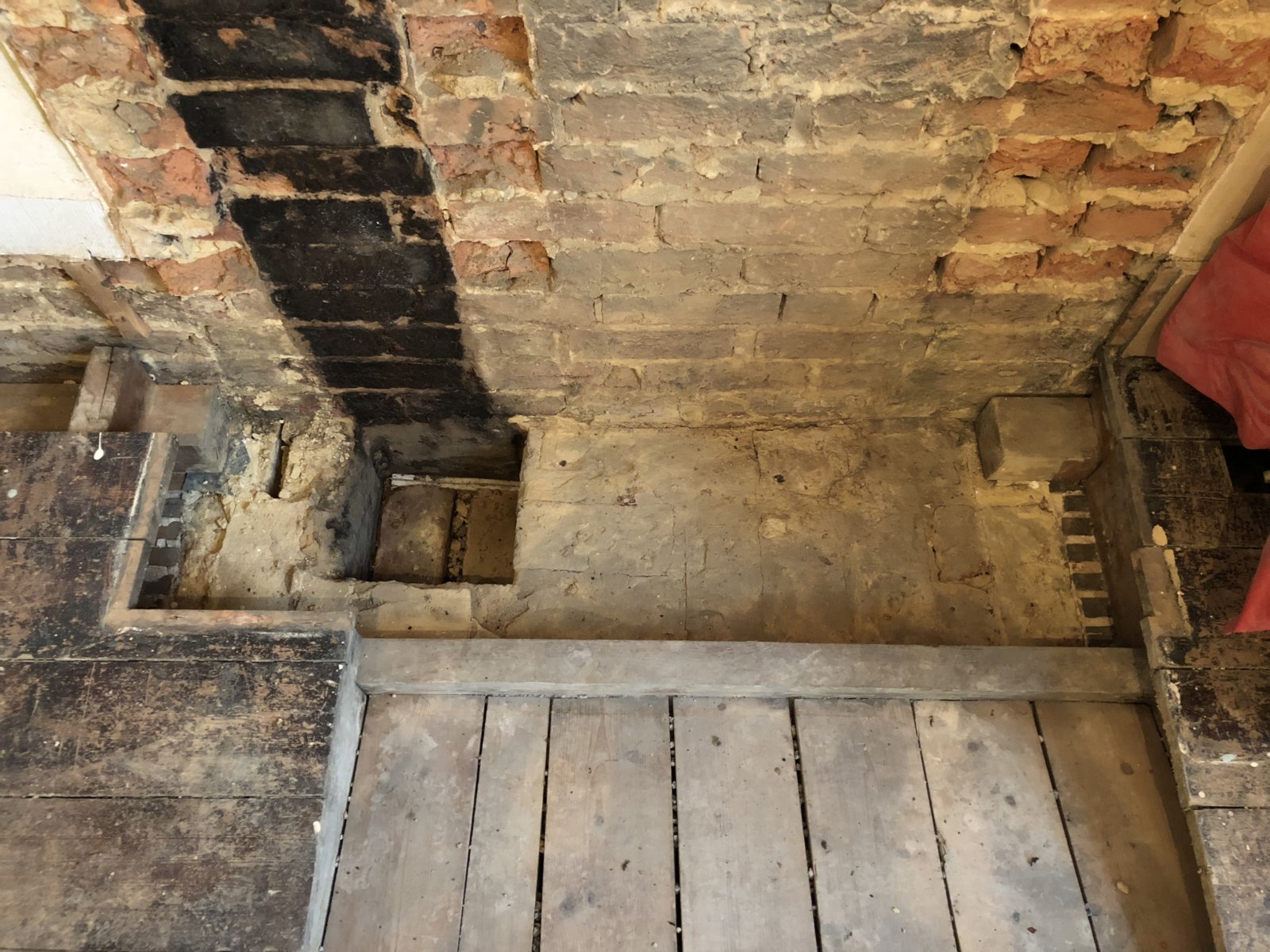 It looks like the 1st floor joists are sitting on timbers that are resting on the chimney.
