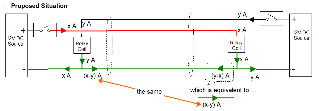 The thing about the proposed arrangement is that current in the 'common' conductor would be flowing in opposite directions for the two circuits. If (as is far from impossible) both relays were activated simultaneous and if they were drawing the same current, the net current in that common conductor (the 'return path' for both relay coils) would be zero. I am therefore trying to get my head around the question of whether it would actually work.