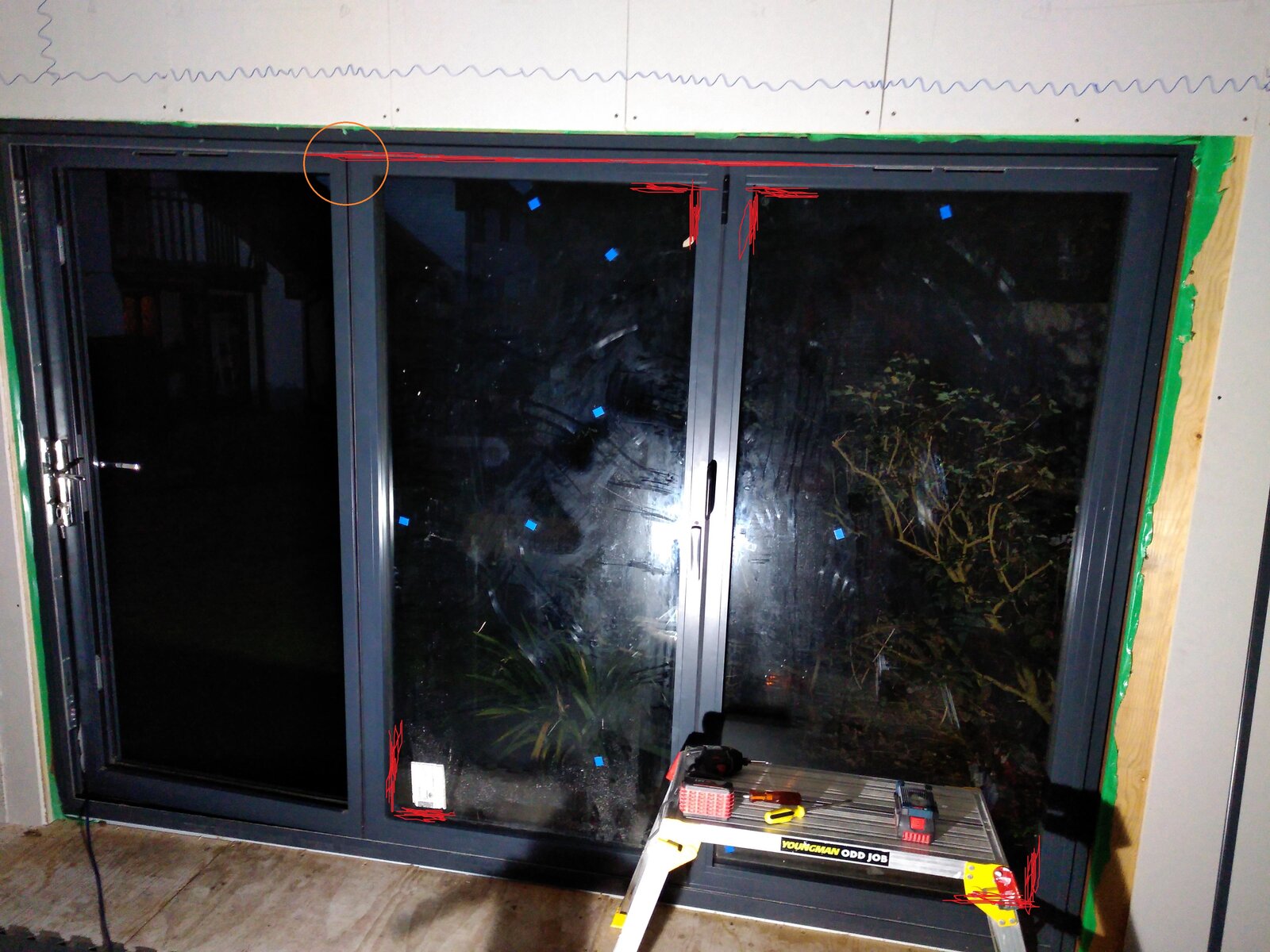 I've got a really annoying problem with some bi-fold doors that I have fitted. I'm at the finishing stage of fitting the glazing, and it's not quite going to plan. The frame and doors were fitted just fine, as far as I can tell. The doors opened and shut really smoothly. Looking from the inside, the doors open from Left to Right.