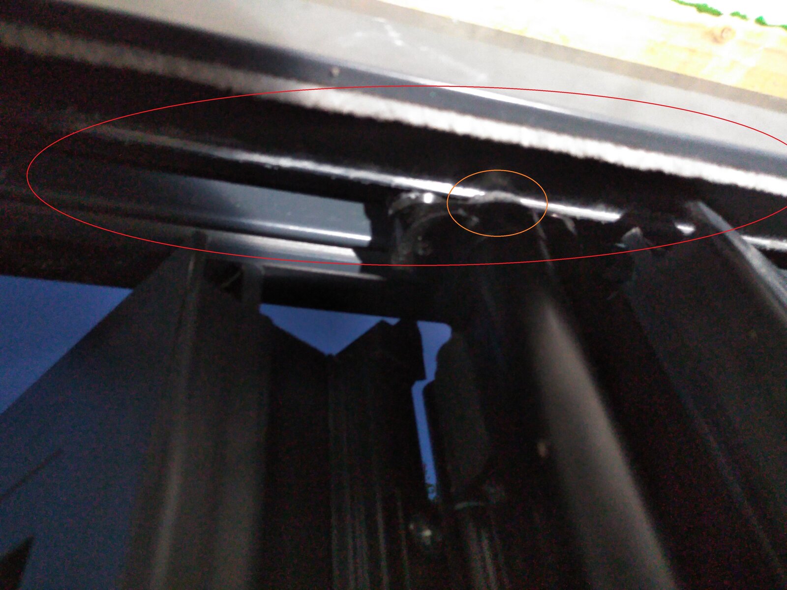 Picture 2 shows where the top roller has been catching and scratching the inner edge of the frame, and the orange circle shows the top roller/bogey that is catching