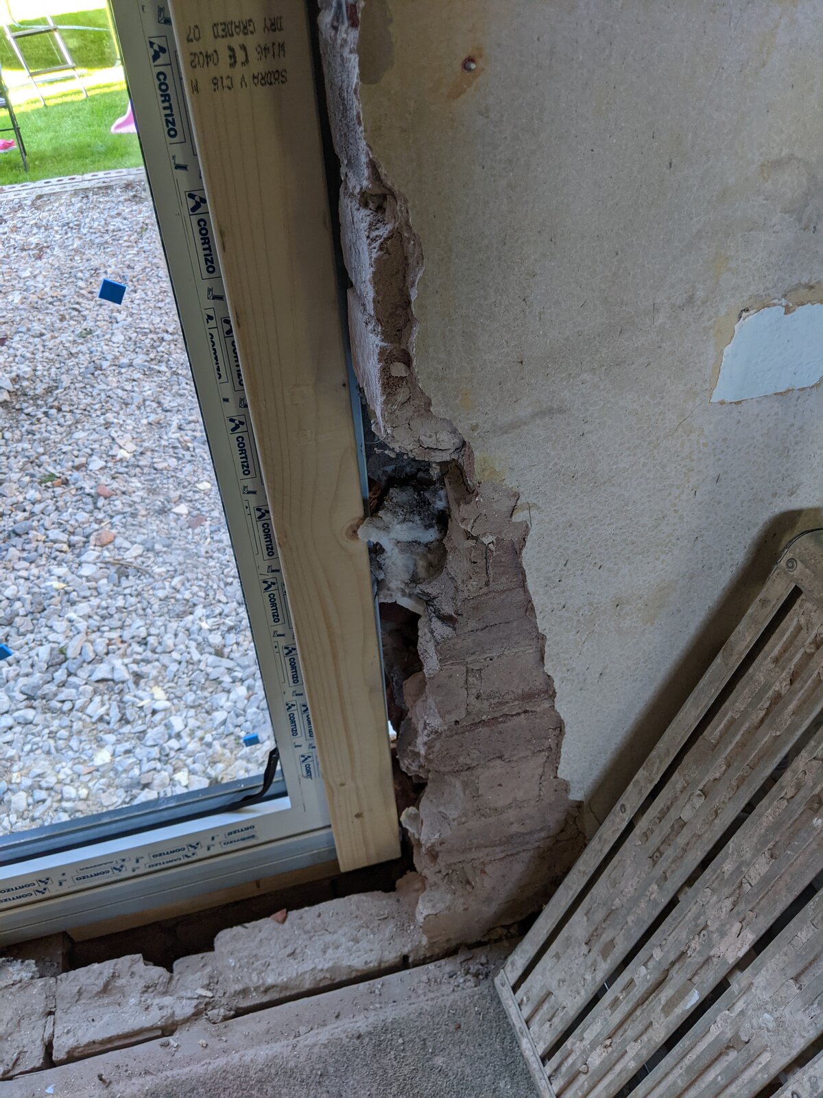 Hi notch7 I'd have been happier with plastic packers in the void and some mortar....I just can't accept softwood at ground level....amazes me how they don't even explain what the plan is....you go to work and comeback to see that. They had plenty of bricks too as they've removed some brickwork either side at the bottom which had windows sat on with a French door in the centre. Assuming they used a Stihl saw outside to cut the brickwork....should I accept this inside....seems like they've just hacked it off.