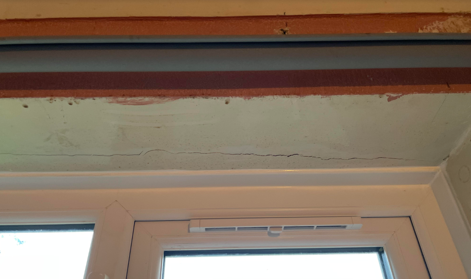 Today I noticed that there was a large horizontal crack on the top window reveal - photos attached. Material feels plasticy but inside is like plasterboard or something, not sure exactly what it is. I am wondering if its the brickwork on the exterior "coming down" causing the crack and a minor slope on the top of the reveal. The slope isn't massive but its noticeable, further down after where the crack is. Not sure if it was sloping originally when bought the house 2 years ago.
