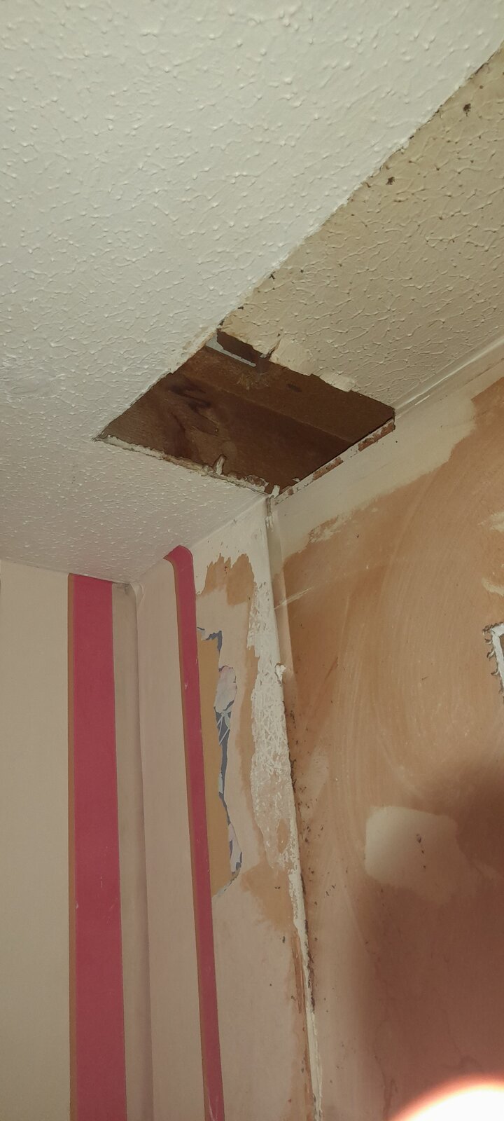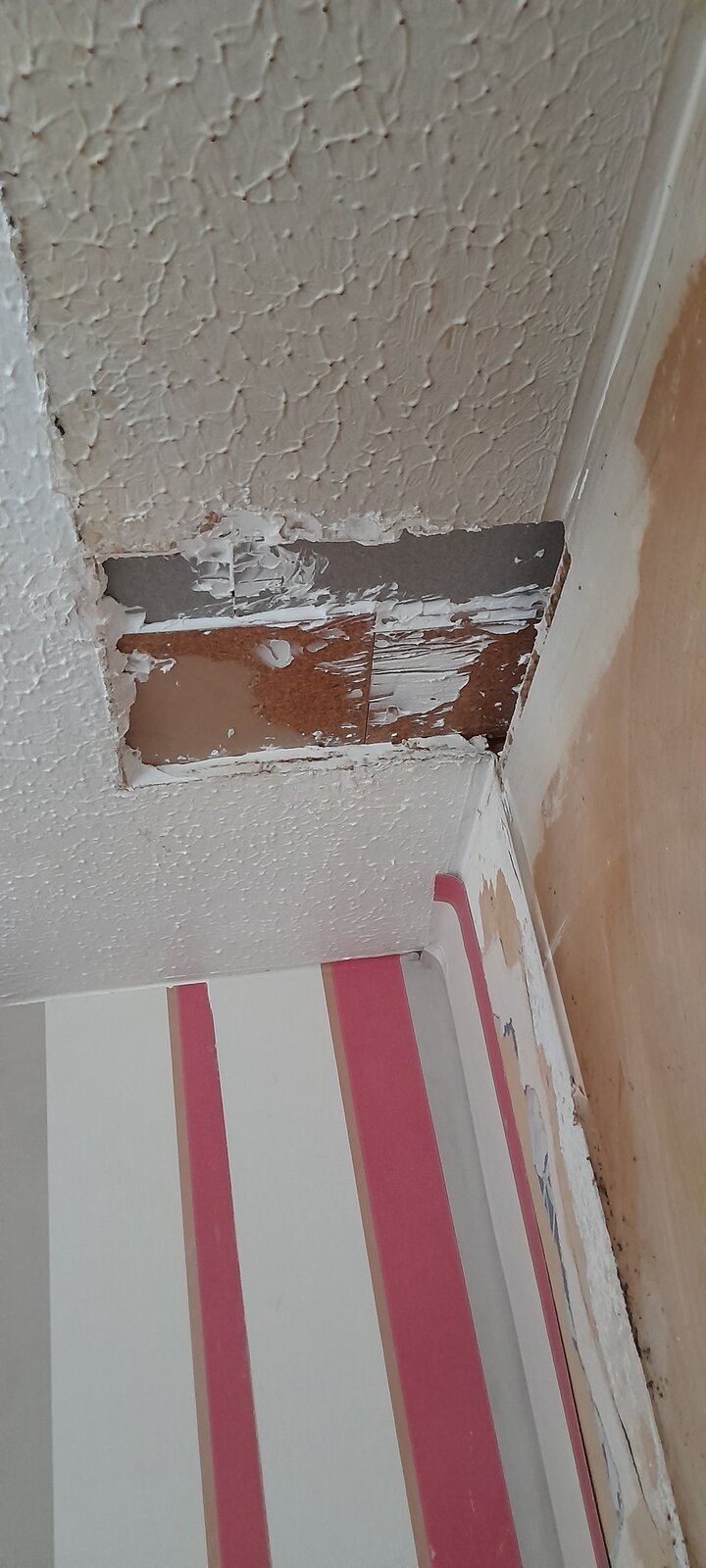 I had 1970s Central Heating removed from kitchen and this was the result; as you can see the massive metal vent was hanging out of the kitchen ceiling then it was sawn off leaving a hole as follows; ...see attachments. I will be putting a cabinet or cupboard over the hole so it won't be seen but i wanted to cover over it.