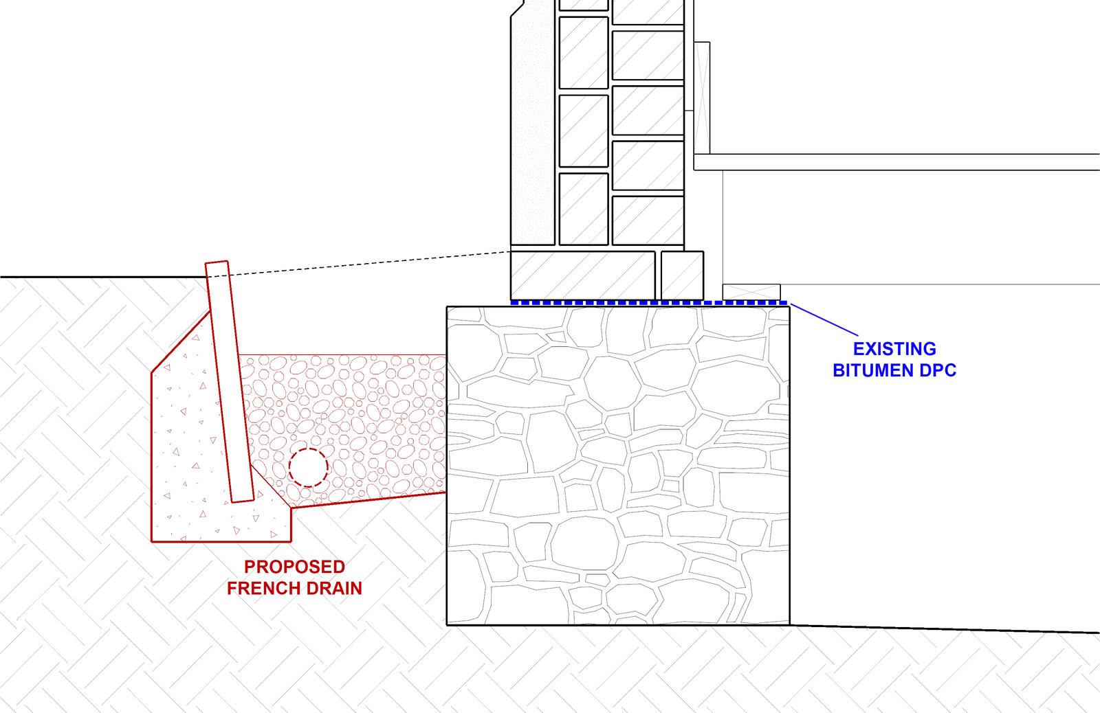 - I am in the process of installing a French drain around the front of the property. This will be around 400mm deep (the footings are around 600-700mm) and will drain to a small soakaway.