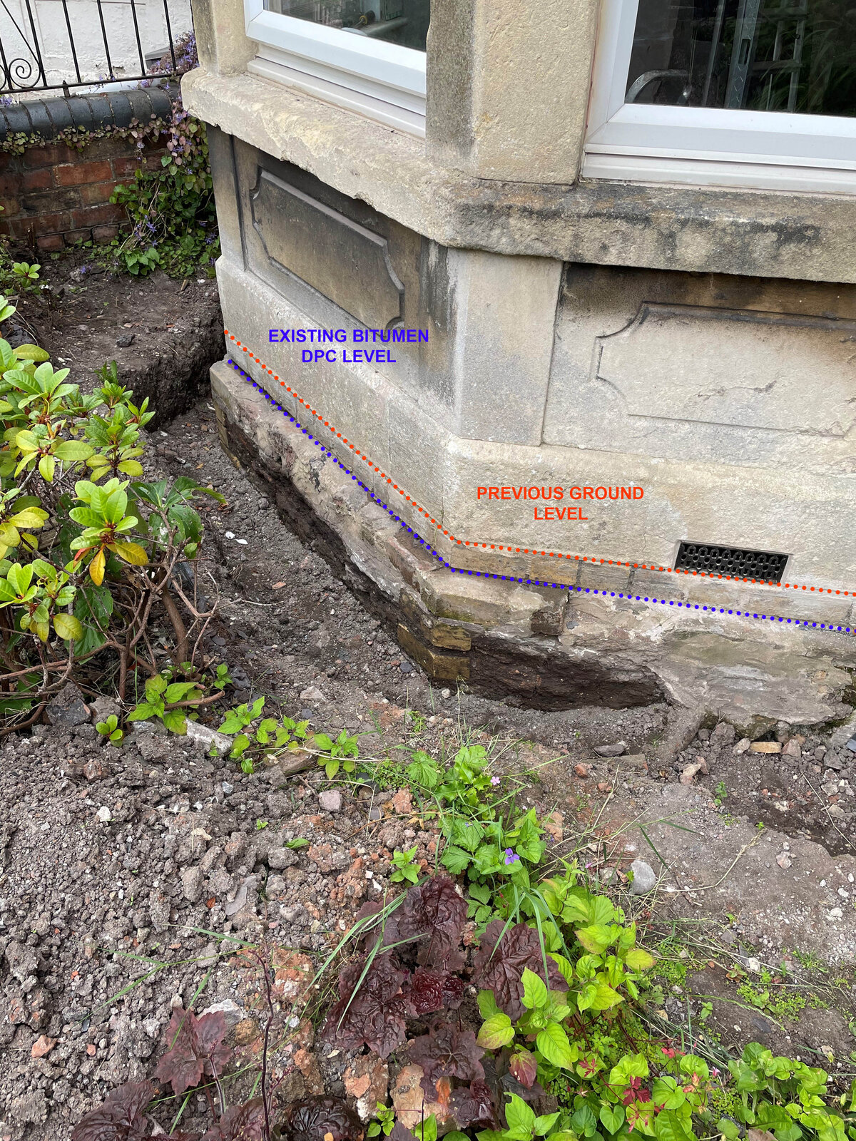 - The external ground levels were previously above DPC level and was formed as a concrete skirt which I have removed (see picture)