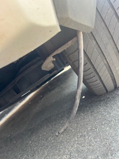 Black rubber tube hanging from rear of car
