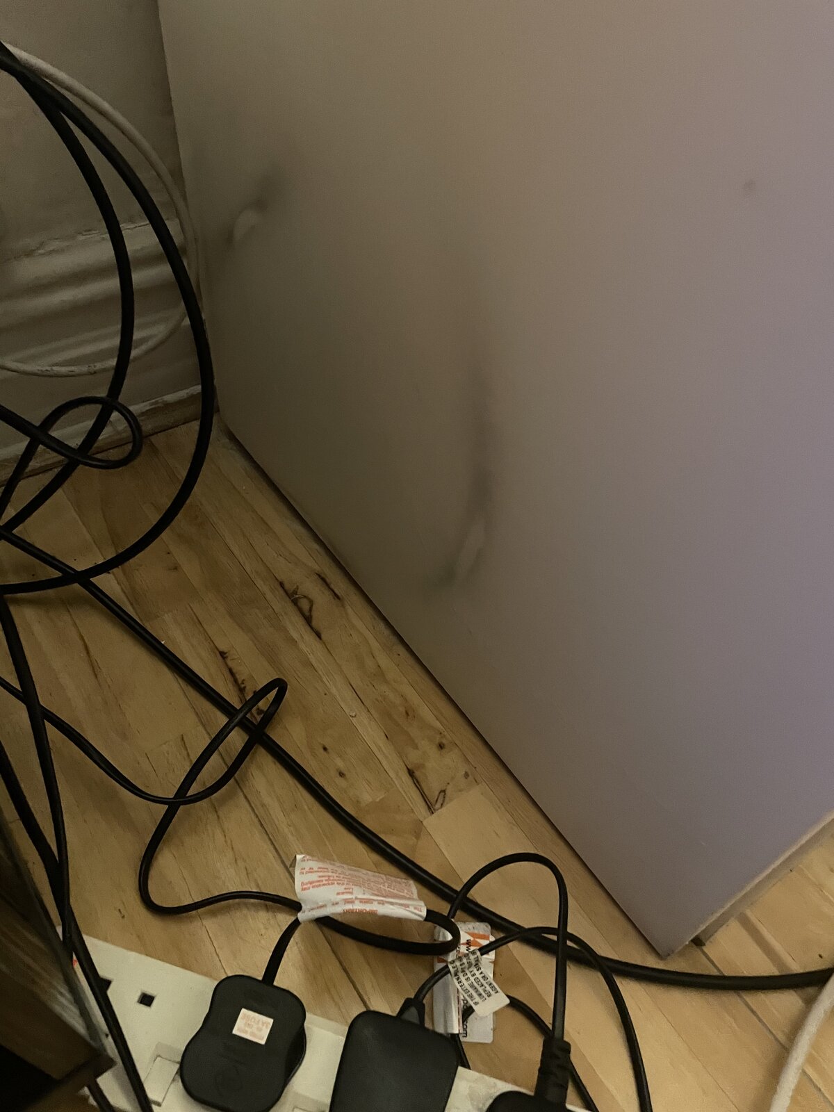 Here is a photo taken about a year- layout hasn’t changed (I’m not home at the moment to take a more recent photo). The black stains are on the cupboard door, and one of the photos is taken on the wall above the box cupboard. Inside that box is the gas meter and gas pipes- no pipe is touching or near the cupboard door