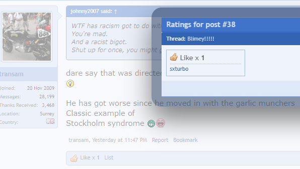 So far, Mottie, sxturbo, Roughcaster and Dangee have added their approval to transam's racist posts.