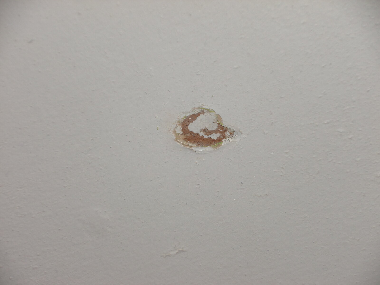 I recently repainted the ceiling in our bathroom and after a couple of weeks a couple of 'blisters' started to appear. The paint just came away in the end and it was left looking as it does in the image. I am guessing it has something to do with damp(??) What can I do about it? Can I just deal with the these patches with out having to repaint the entire ceiling?