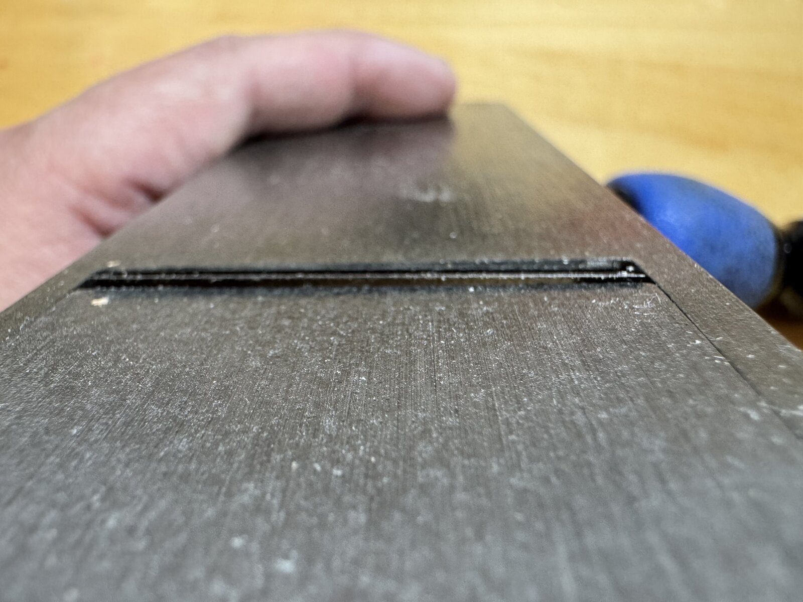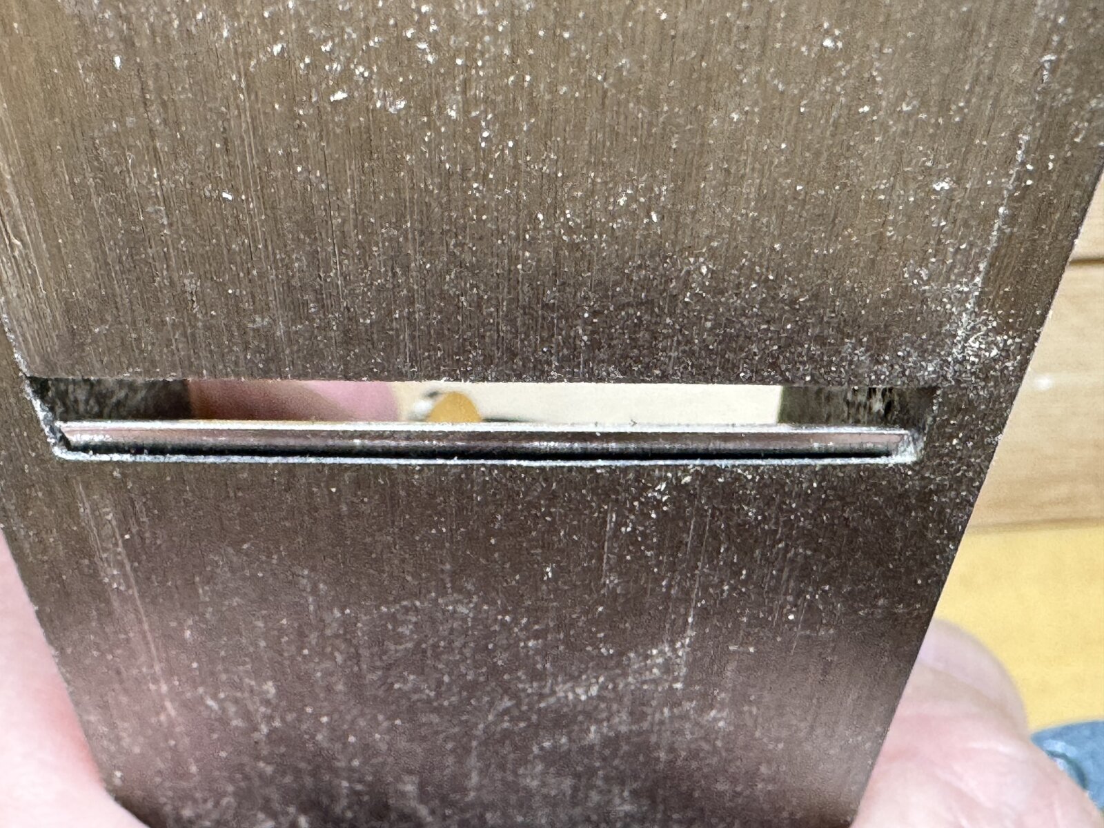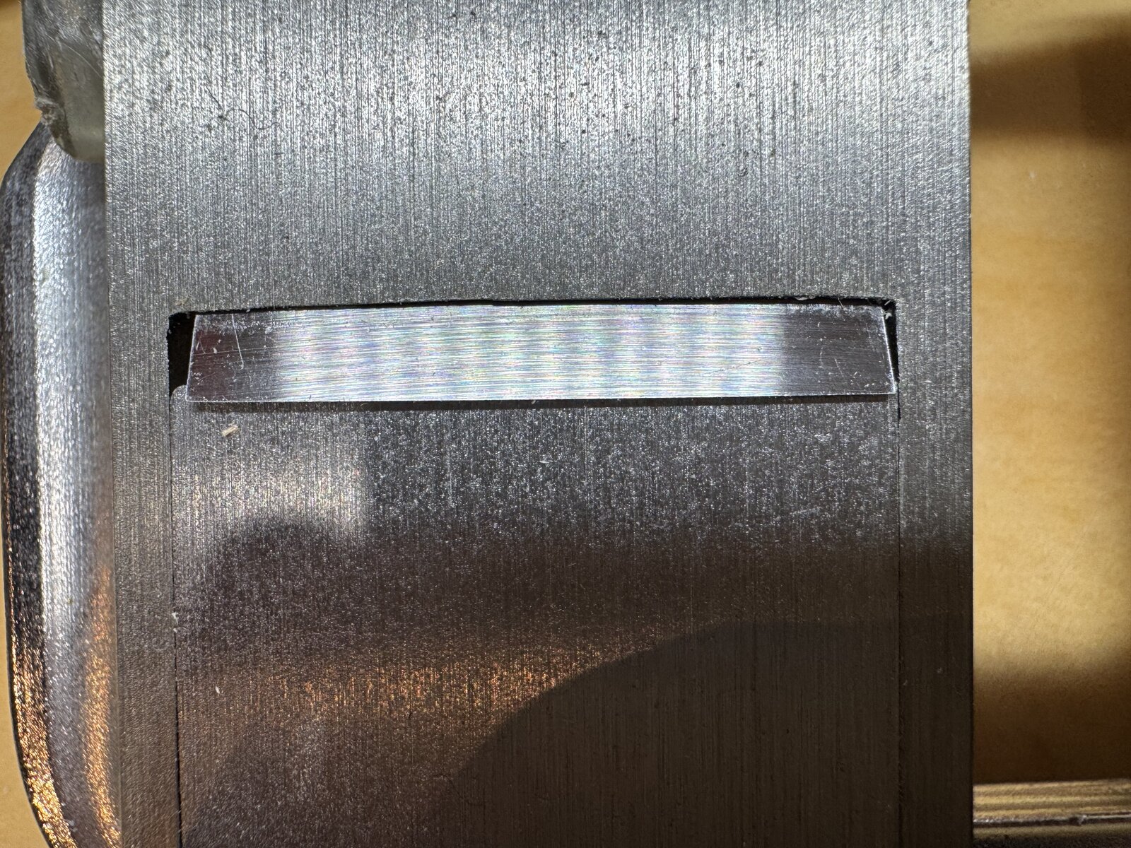 The photo is the edge where the blade slides down. The edge thickness is not parallel. Is this a normal design? I am new to a block plane usage. I would appreciate to have an advice.
