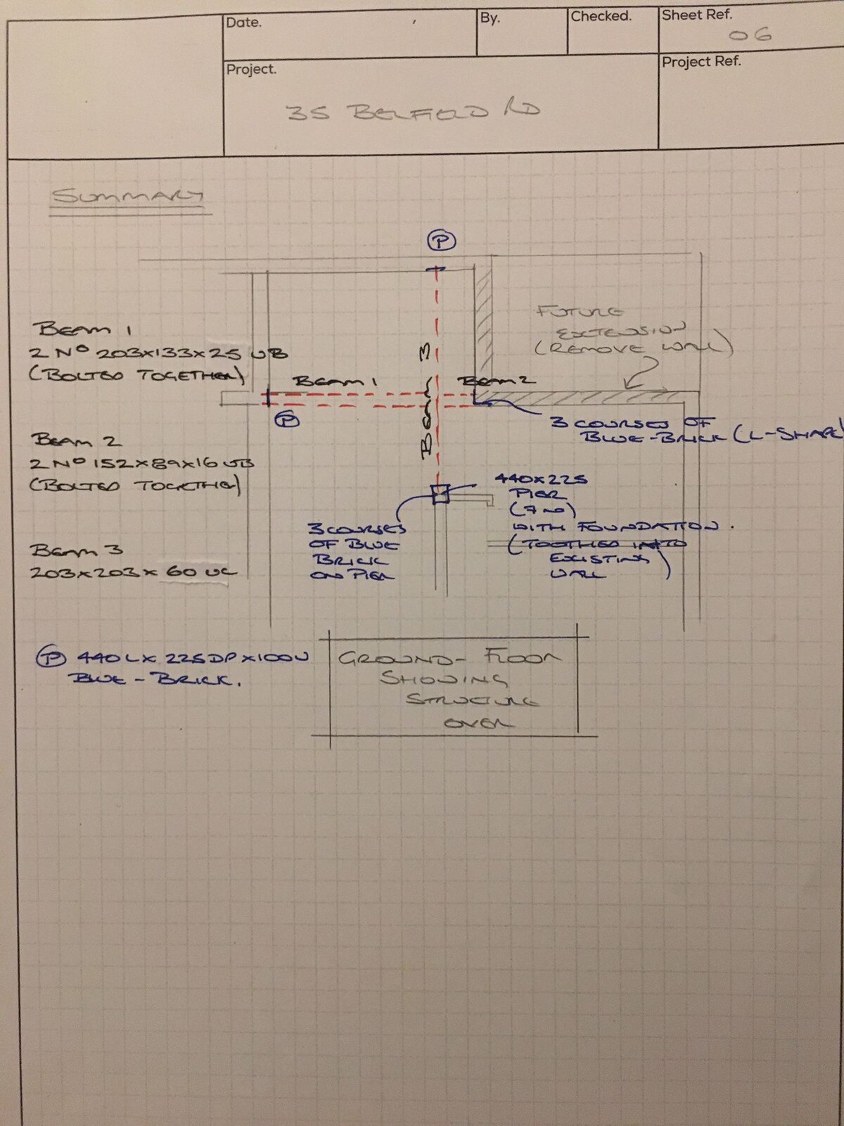 I need to build blockwork piers under each end of beam and tooth them into existing walls.